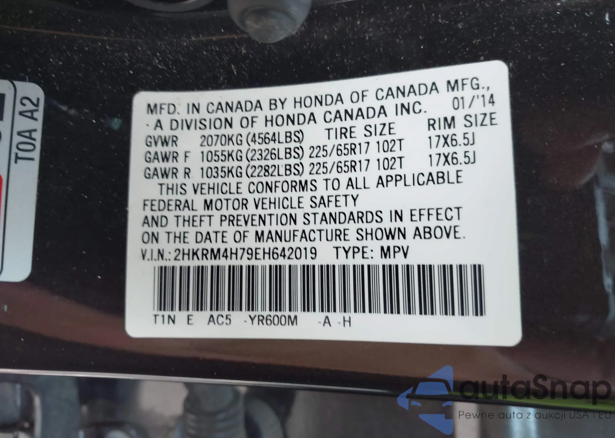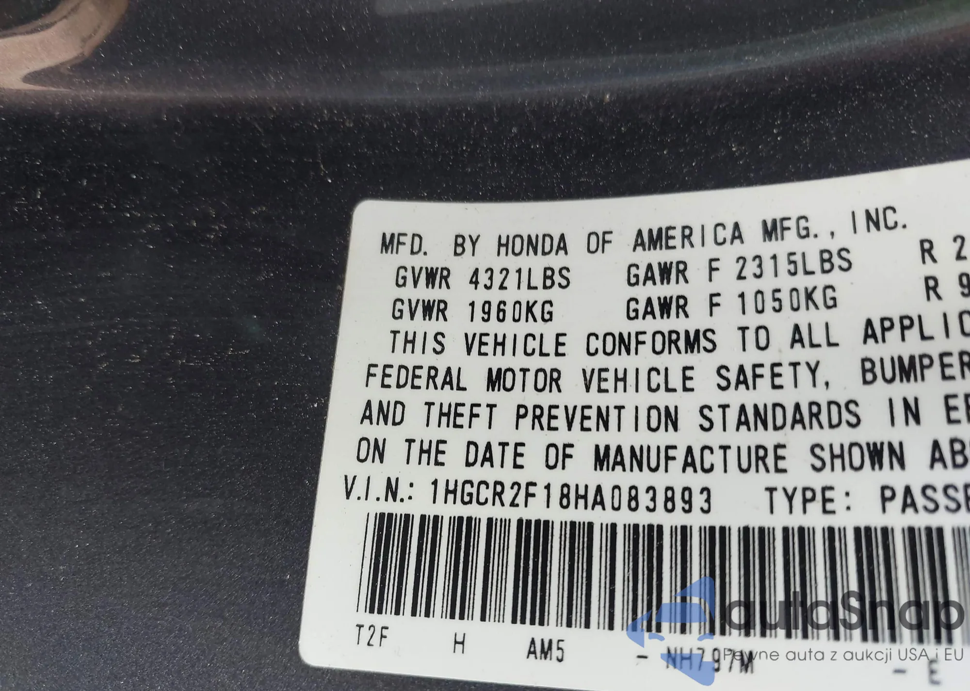 LOT: 42814655 VIN: 1HGCR2F38EA076536