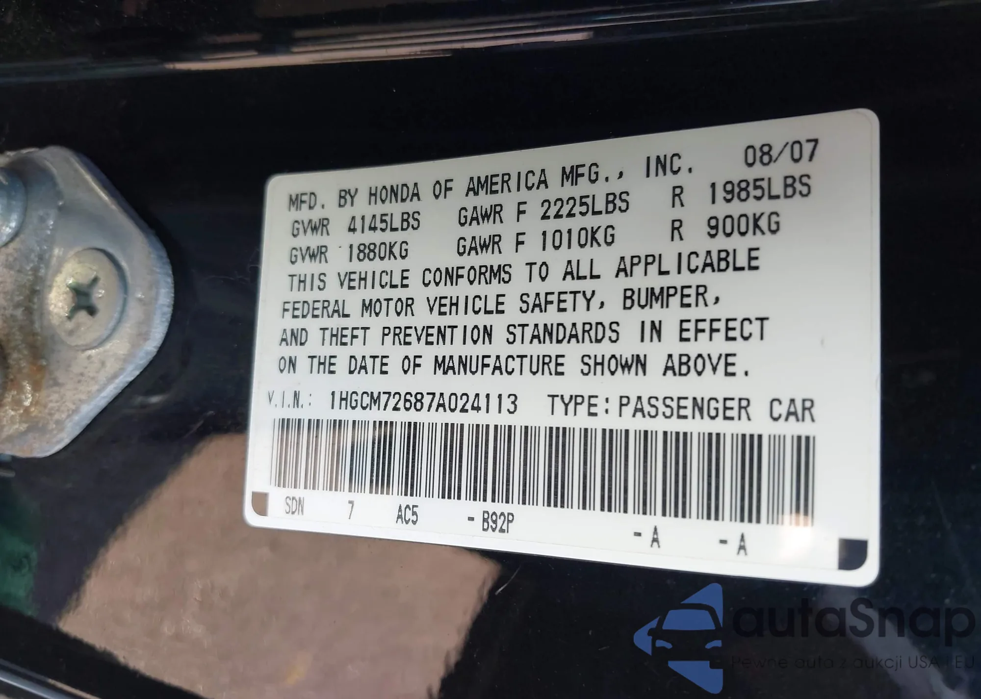 LOT: 42820118 VIN: 1HGCM72687A024113