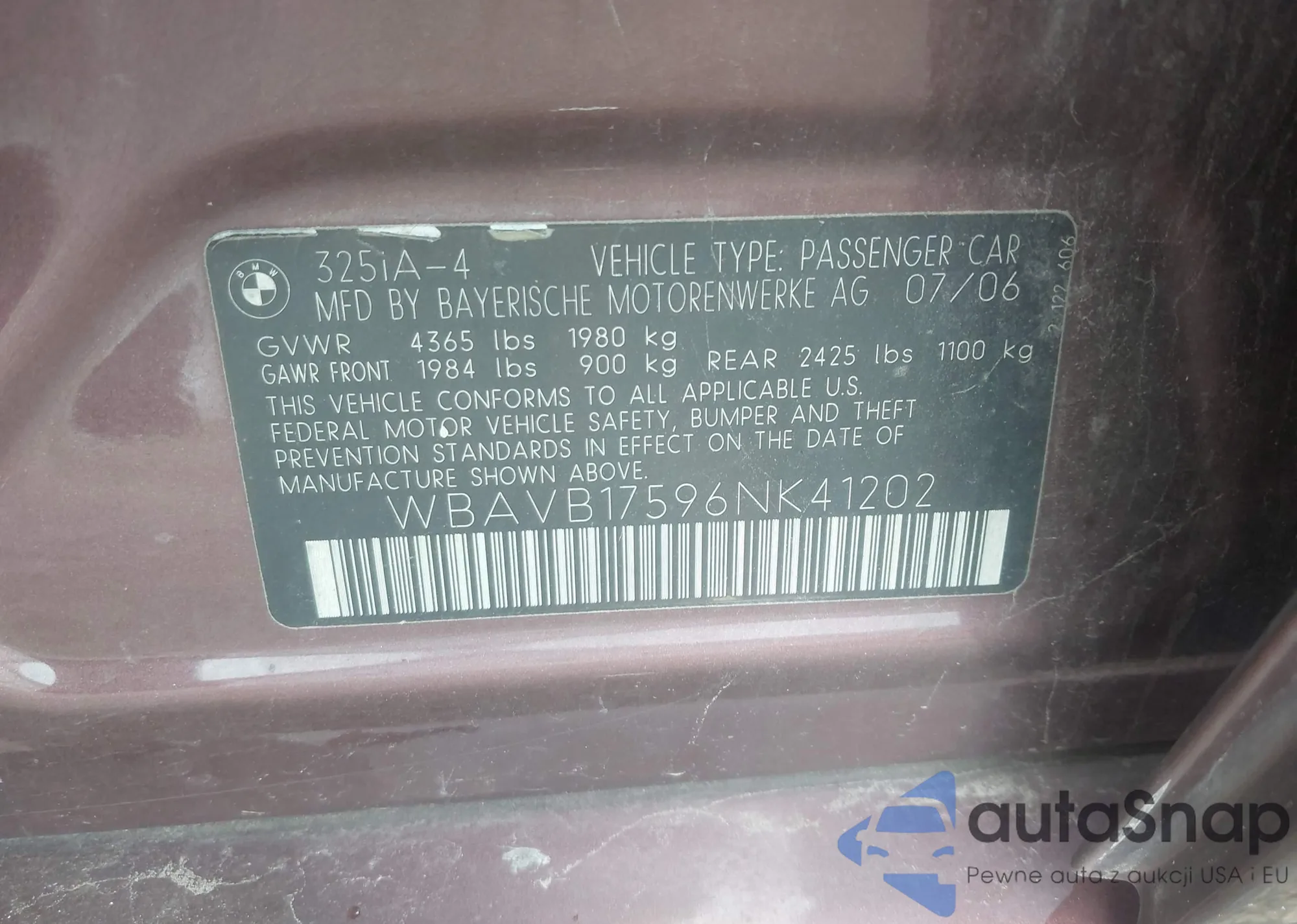 2006 BMW 325I z USA, uszkodzony, nr VIN WBAVB17596NK41202