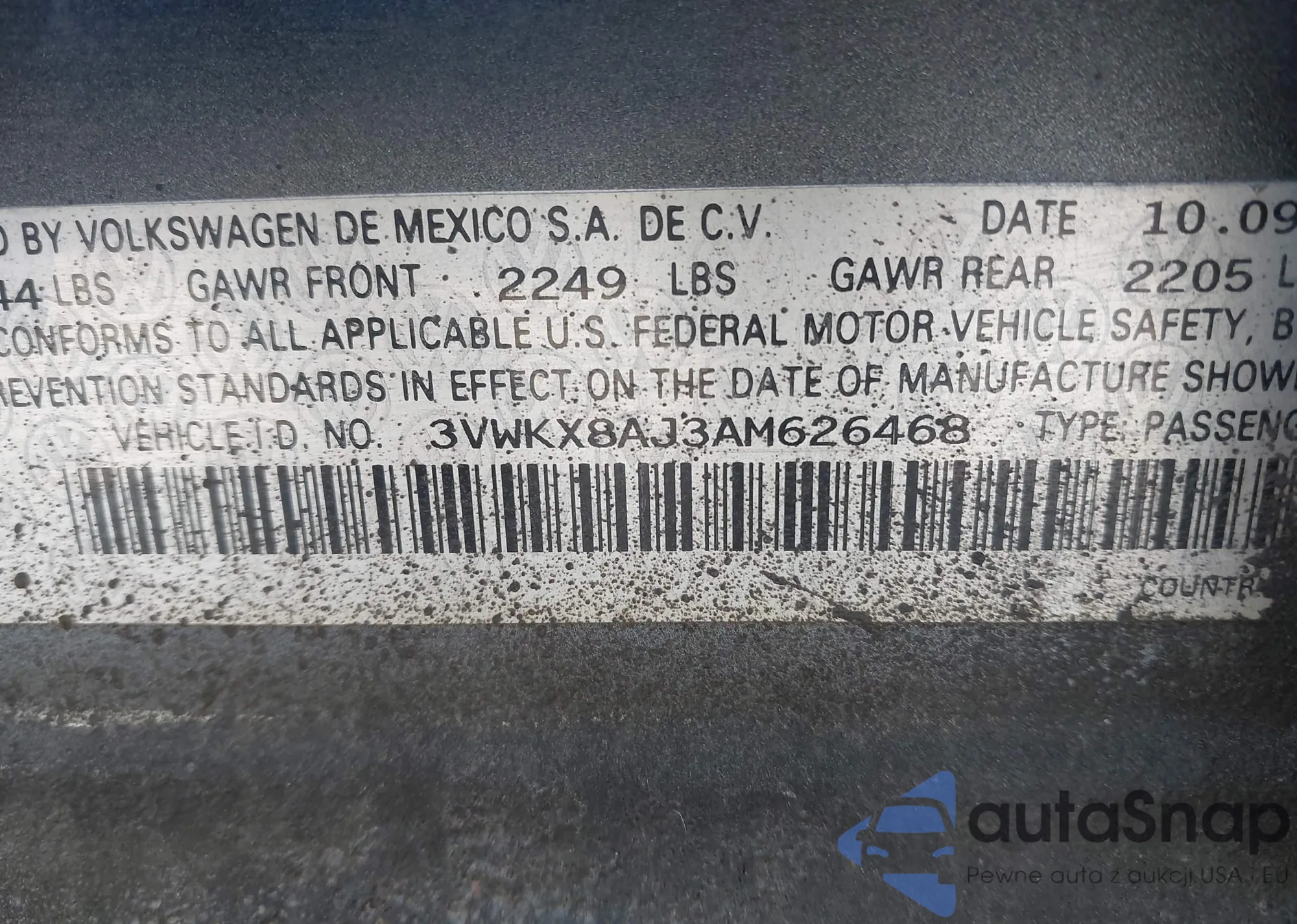 LOT: 42958384 VIN: 3VWKX8AJ3AM626468