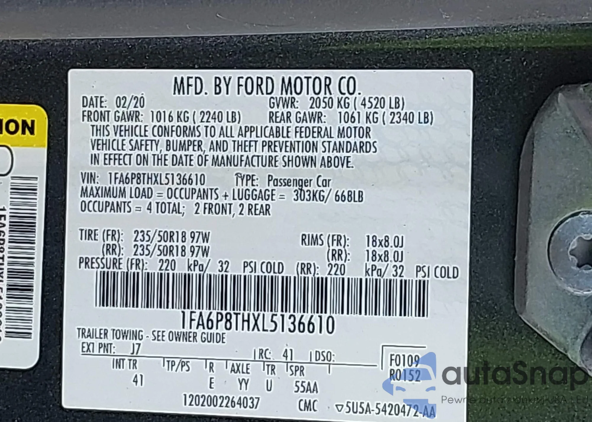 LOT: 42577431 VIN: 1FA6P8THXL5136610