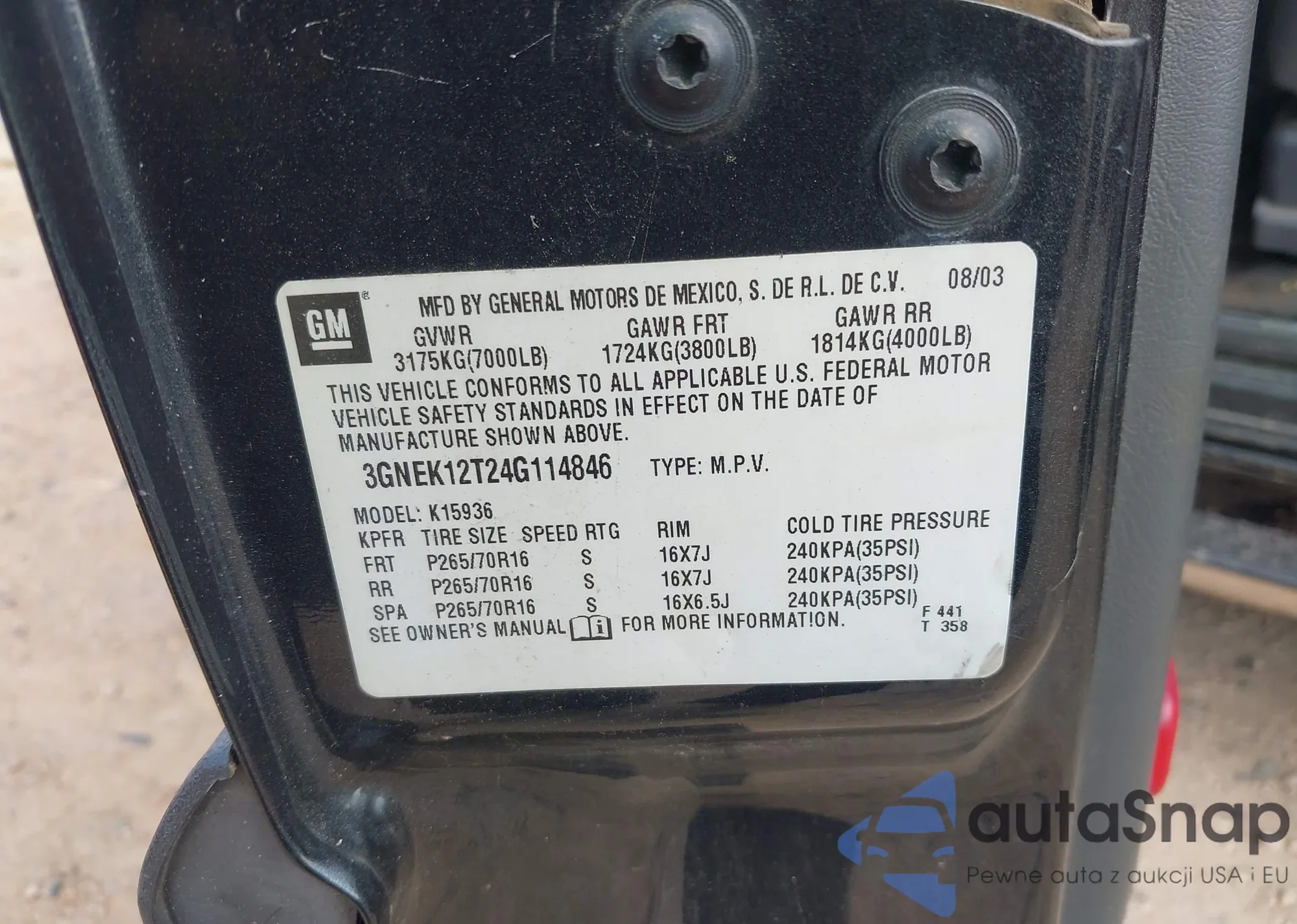 • VIN 3GNEK12T24G114846
