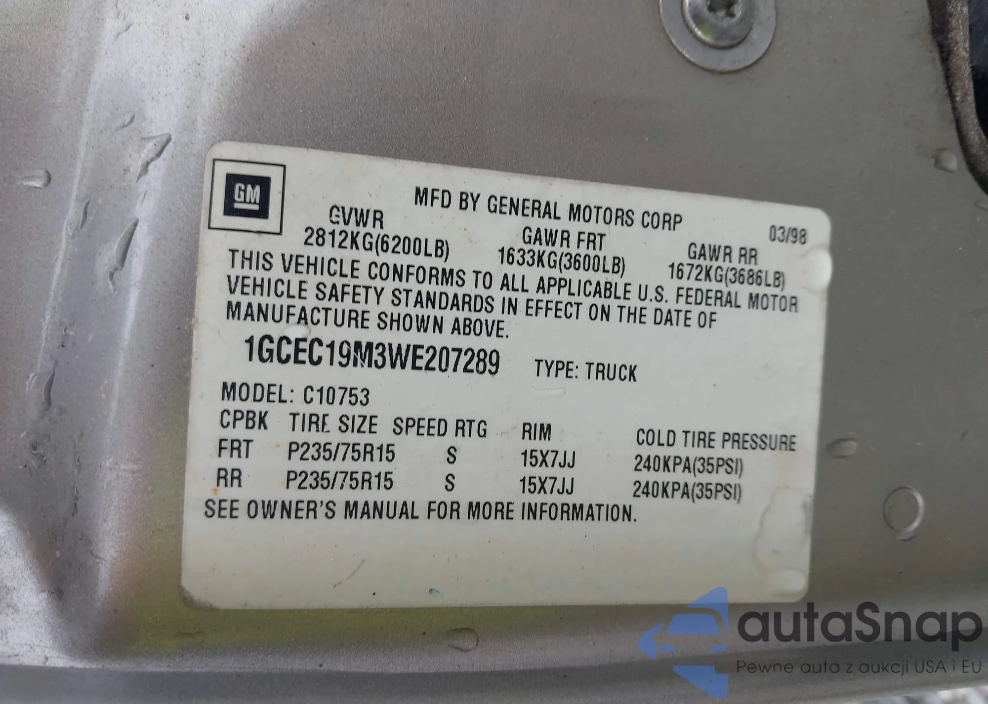 1998 Chevrolet C1500 Fleetside Cmi z USA, uszkodzony, nr VIN 1GCEC19M3WE207289
