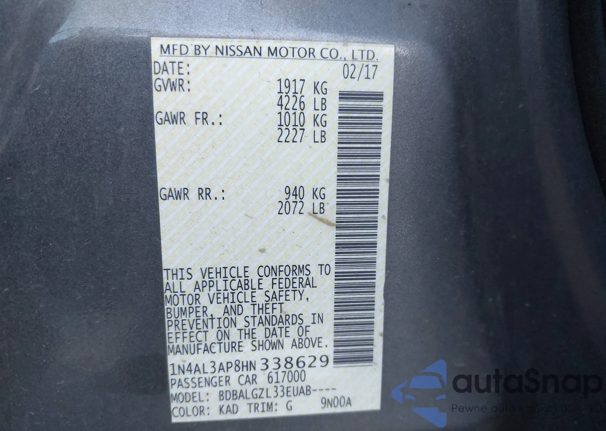 LOT: 42612153 VIN: 1N4AL3AP8HN338629