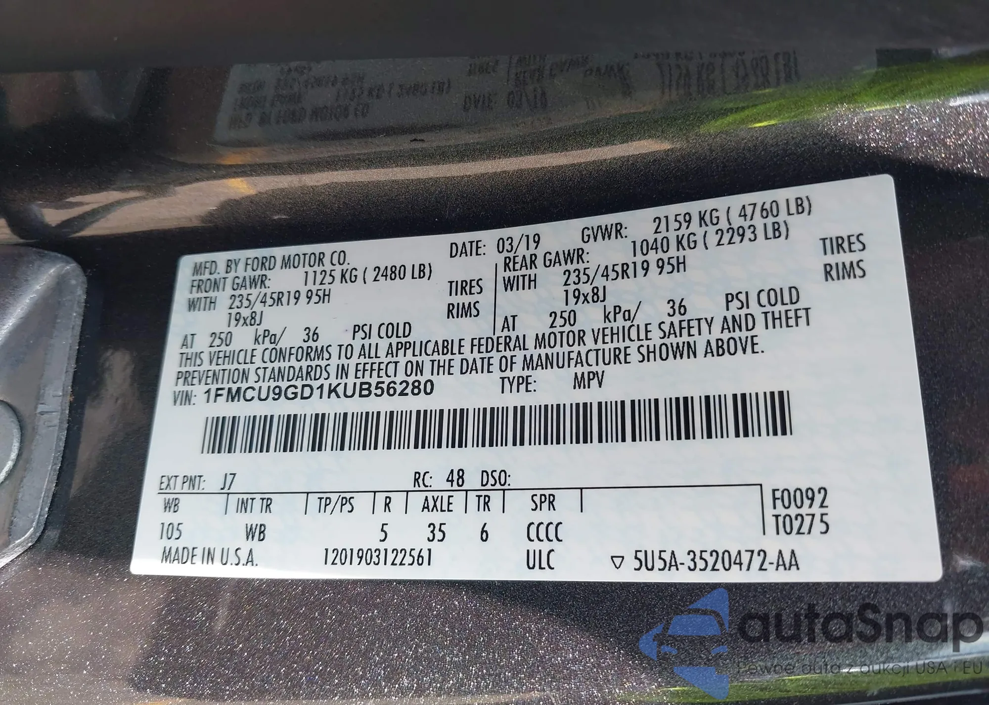 • VIN 1FMCU9GD1KUB56280