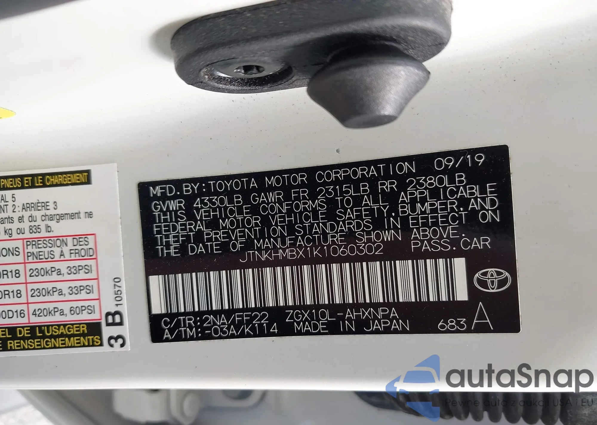 LOT: 42813498 VIN: JTNKHMBX1K1060302
