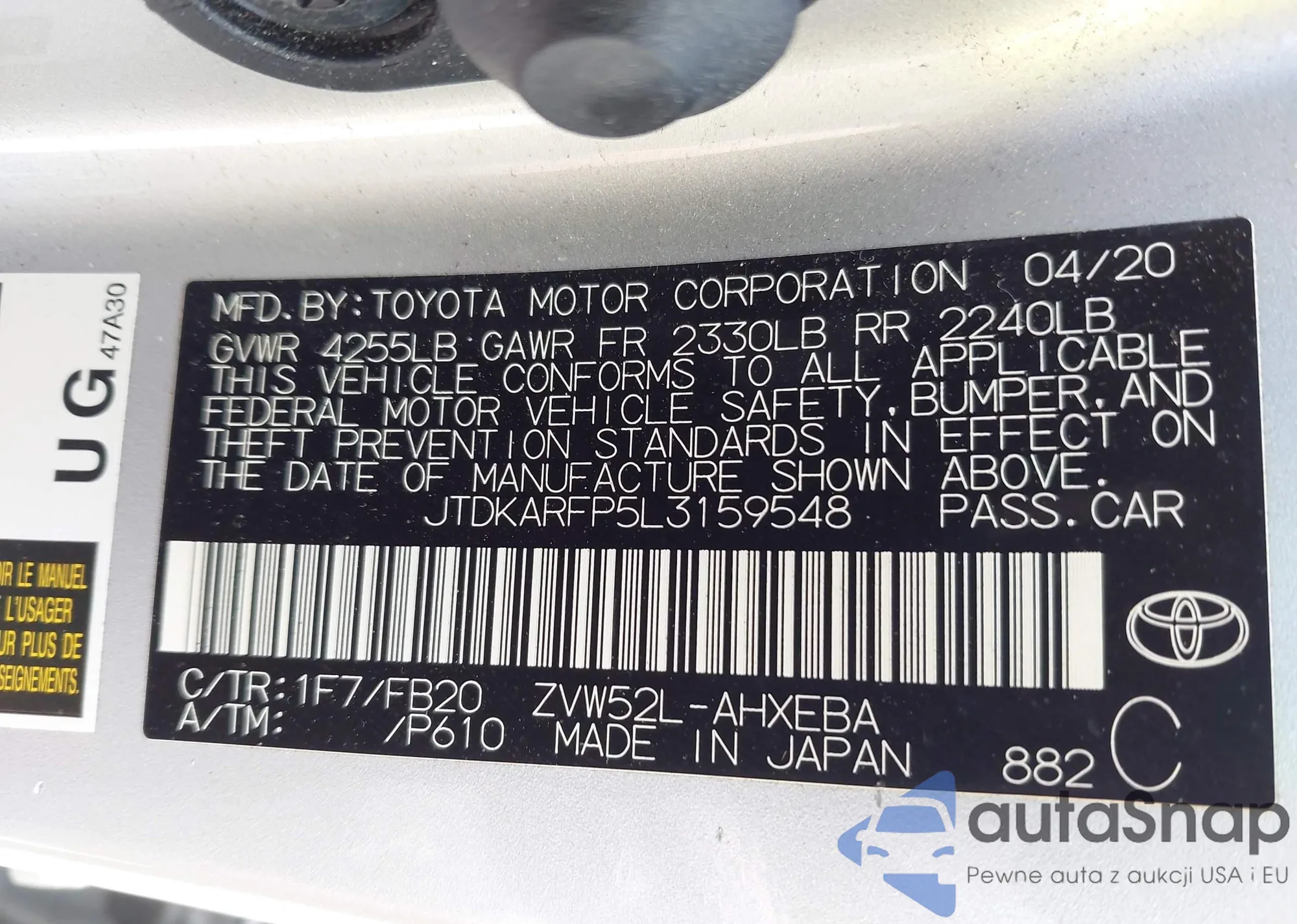 LOT: 42435163 VIN: JTDKARFP5L3159548