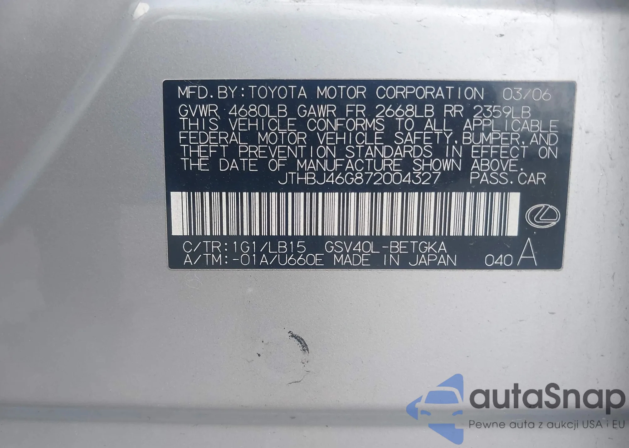LOT: 42651079 VIN: JTHBJ46G872004327