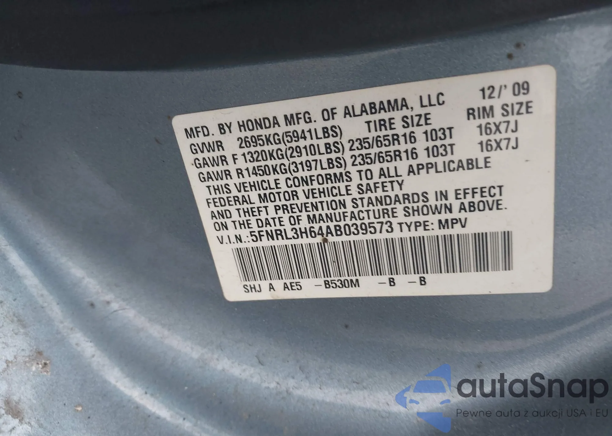 LOT: 42941003 VIN: 5FNRL3H64AB039573