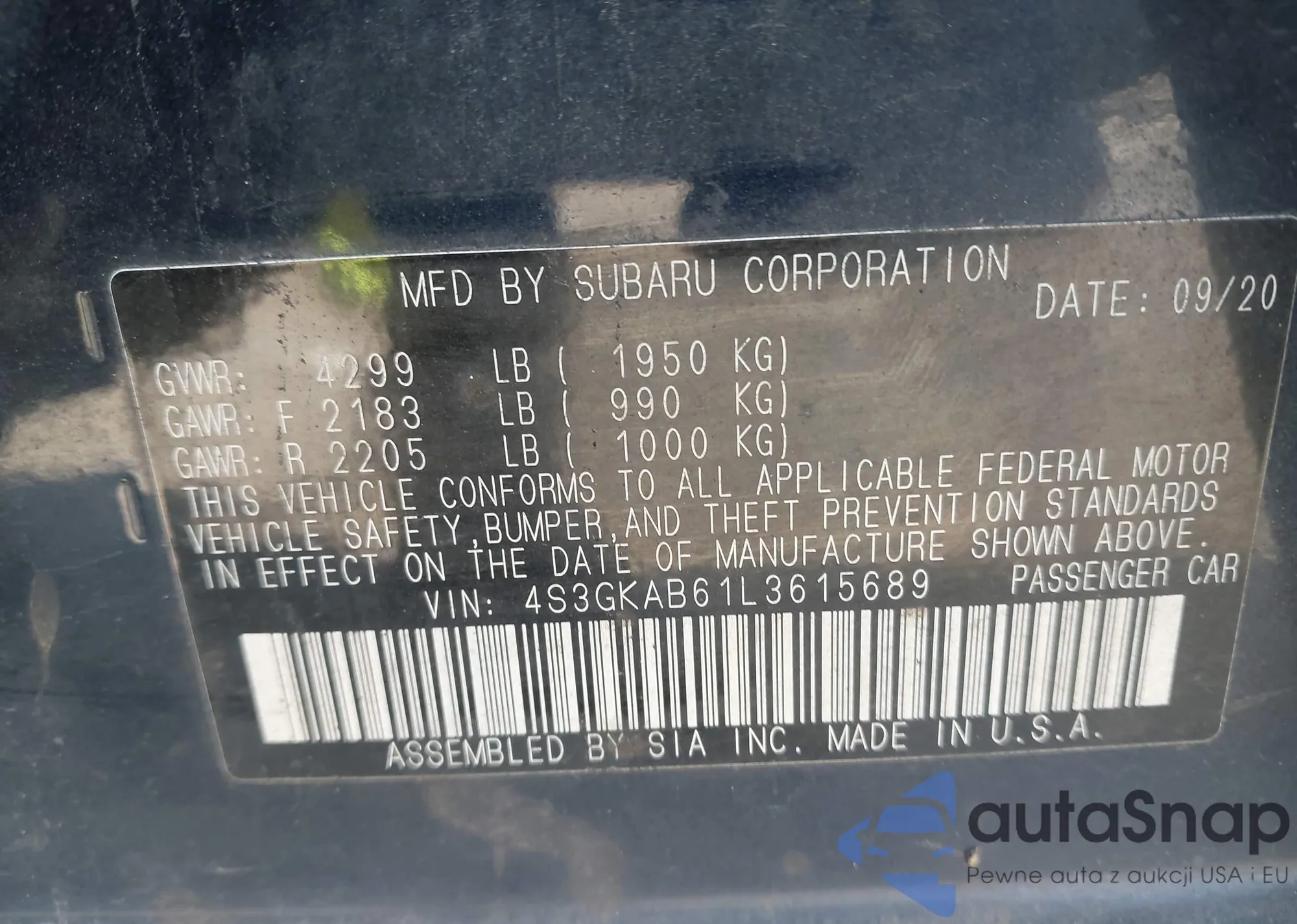 • VIN 4S3GKAB61L3615689