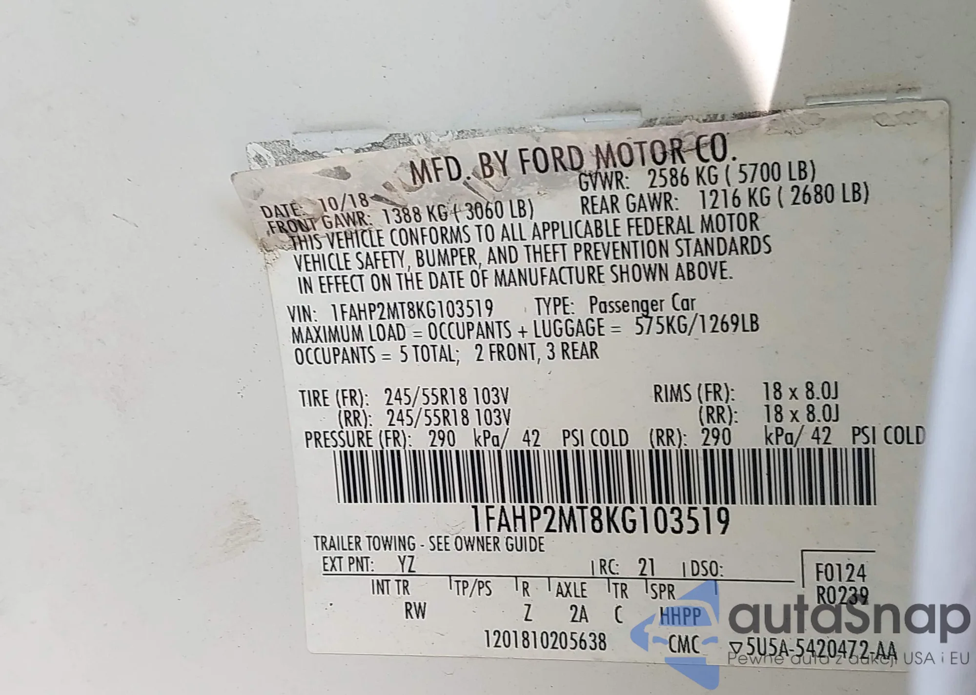 • VIN 1FAHP2MT8KG103519