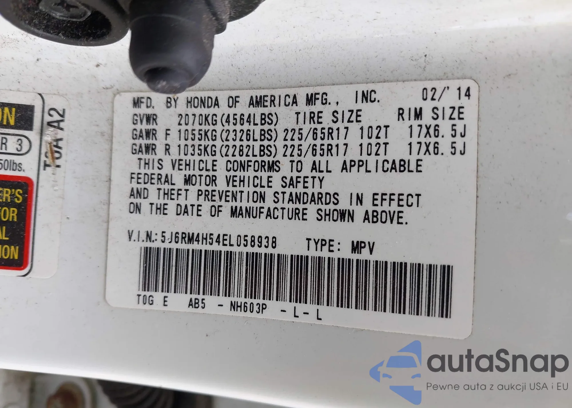 • VIN 5J6RM4H54EL058938