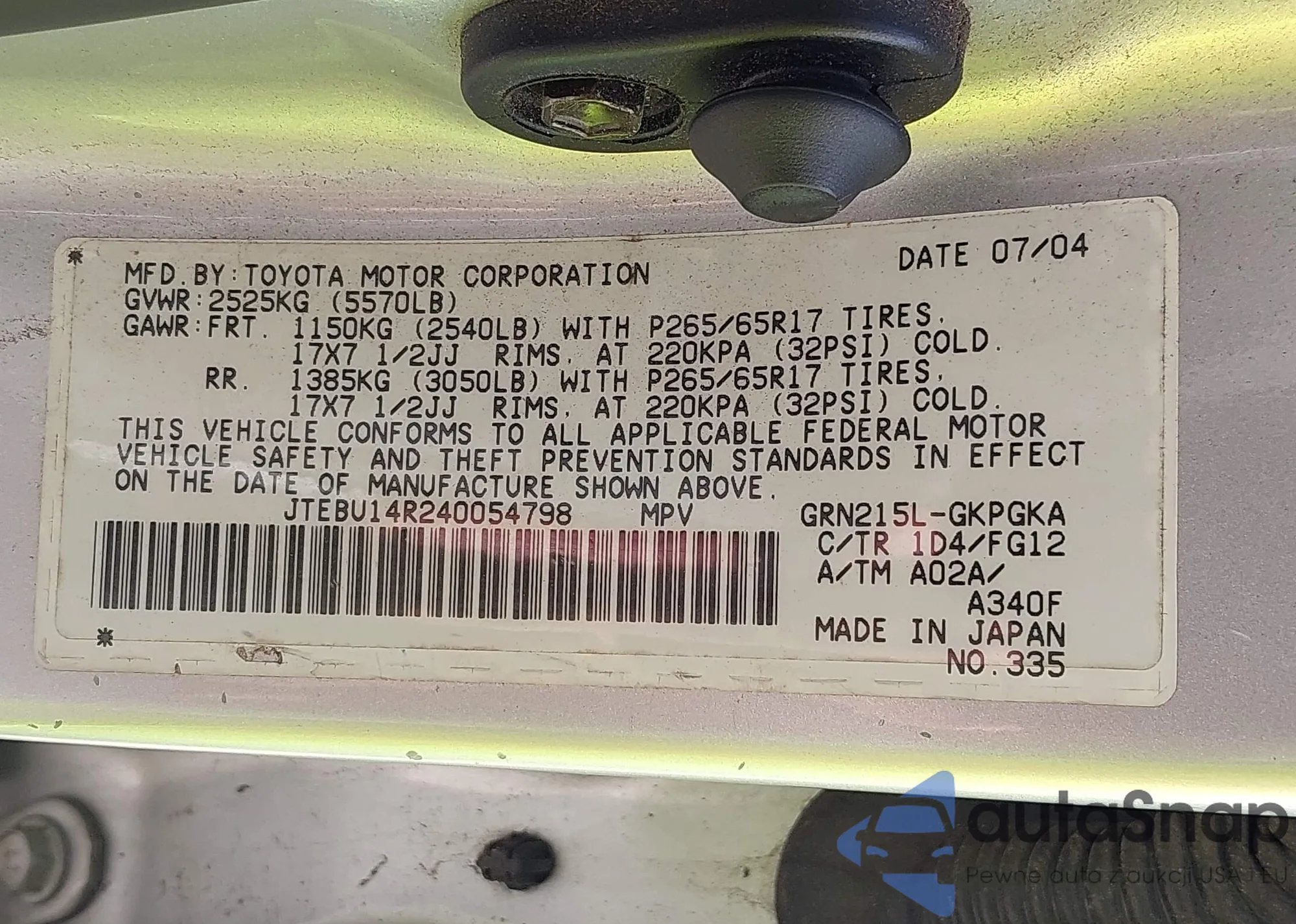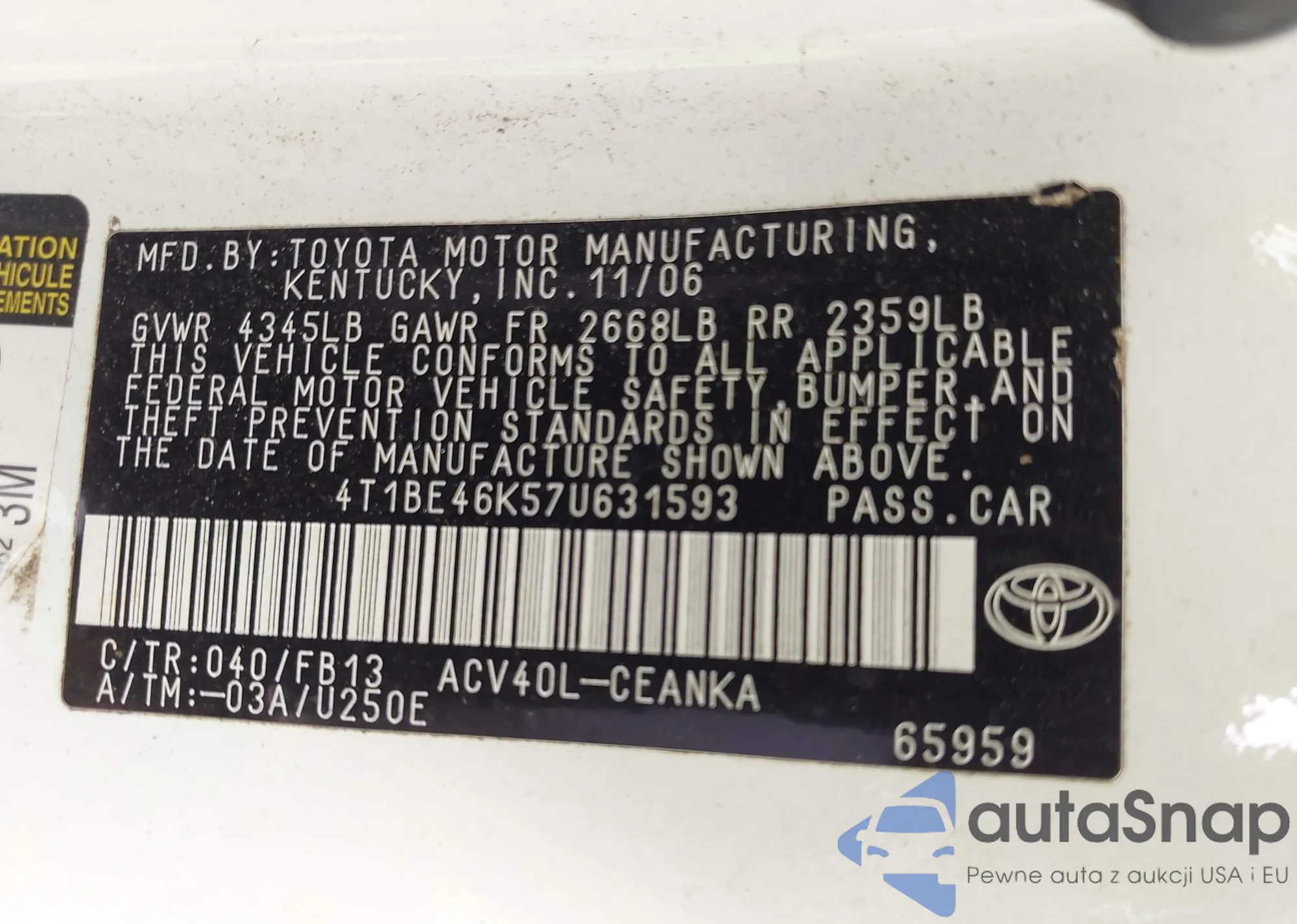 LOT: 42787965 VIN: 4T1BE46K57U631593