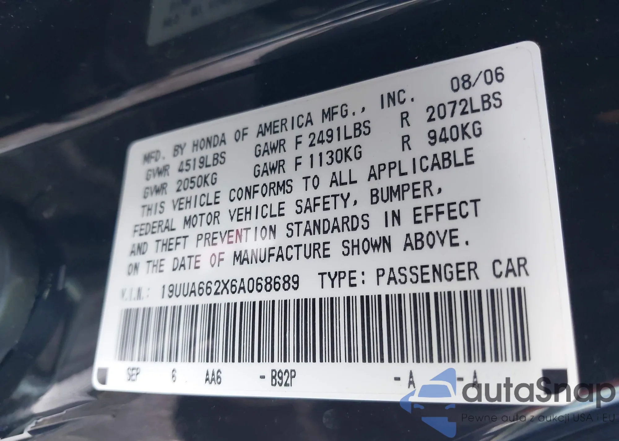LOT: 42059128 VIN: 19UUA662X6A068689