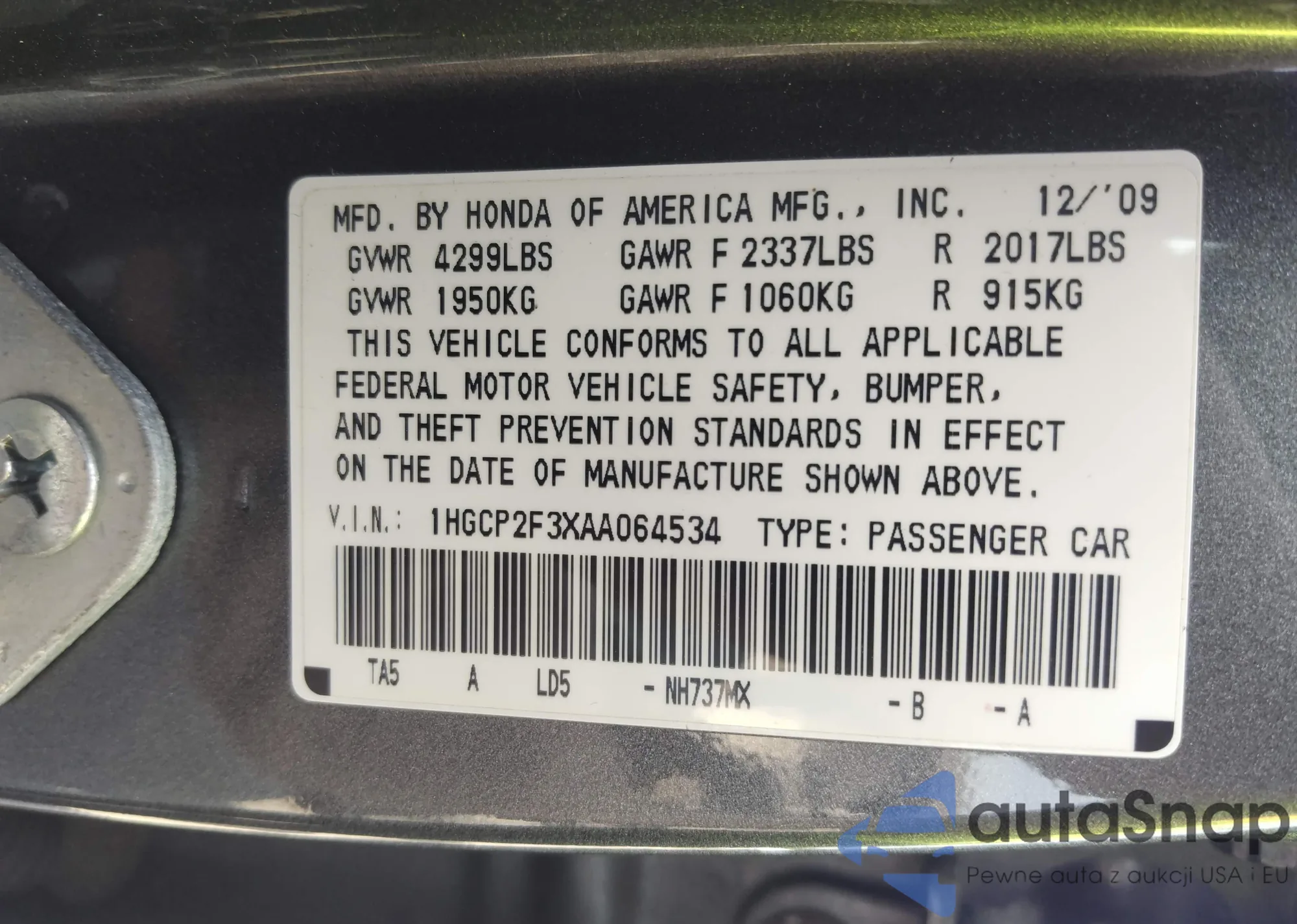 LOT: 42487609 VIN: 1HGCP2F3XAA064534