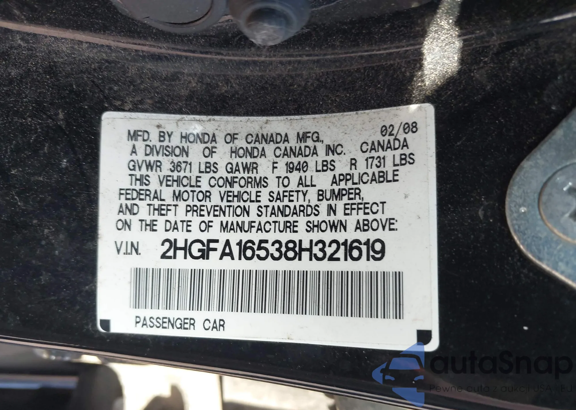 LOT: 42738361 VIN: 2HGFA16538H321619