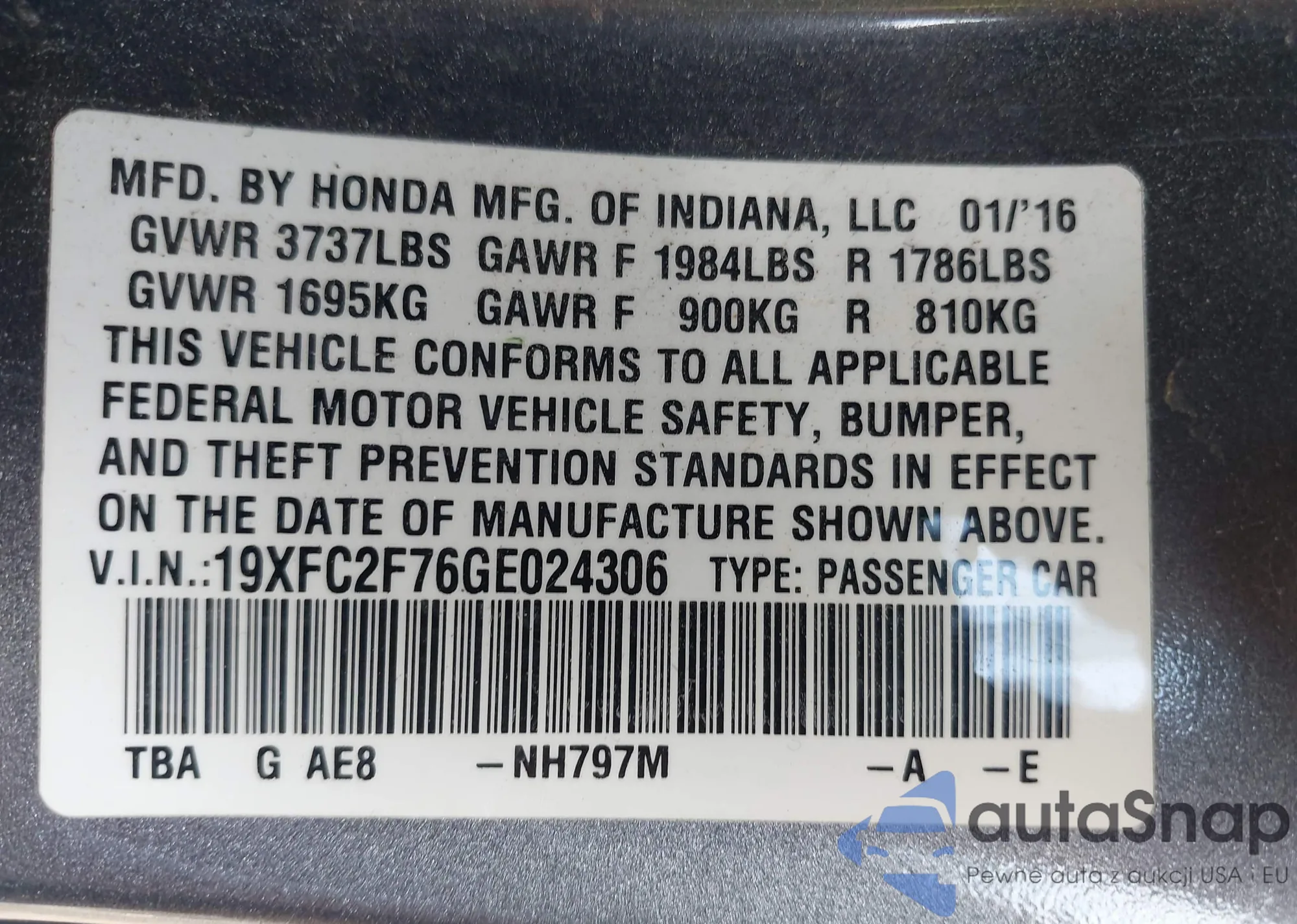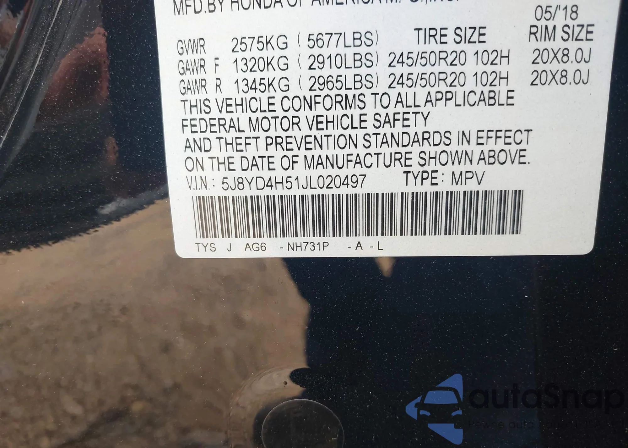 • VIN 5J8YD4H51JL020497