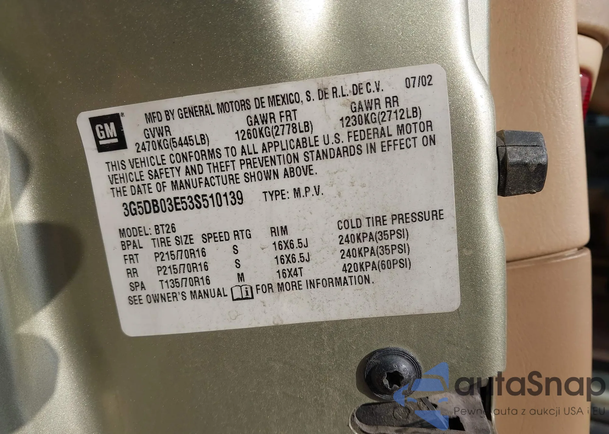 LOT: 42822468 VIN: 3G5DB03E53S510139