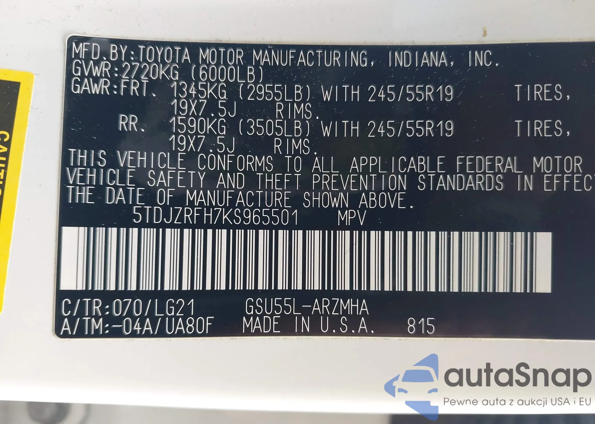 LOT: 42673313 VIN: 5TDJZRFH7KS965501