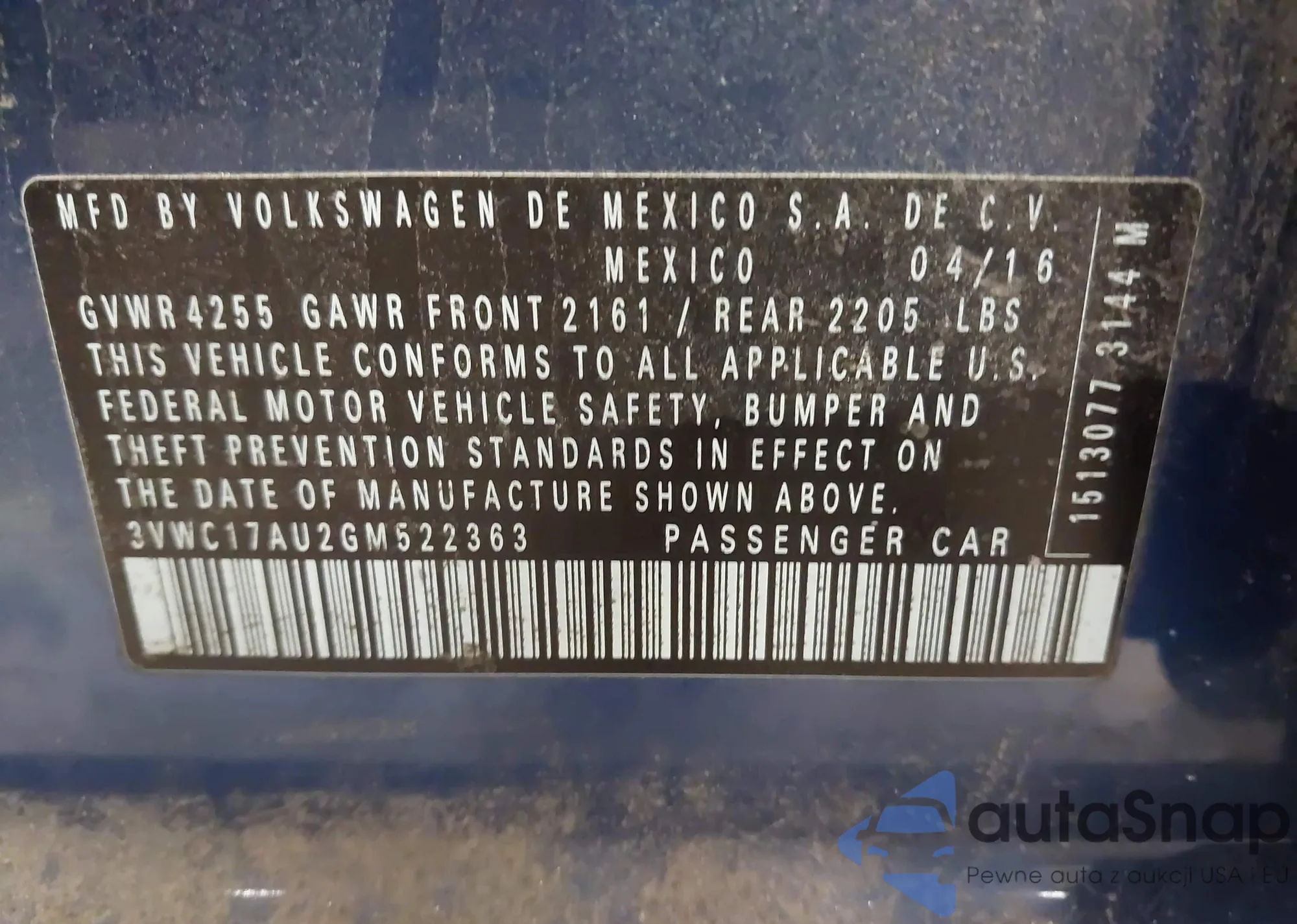 • VIN 3VWC17AU2GM522363