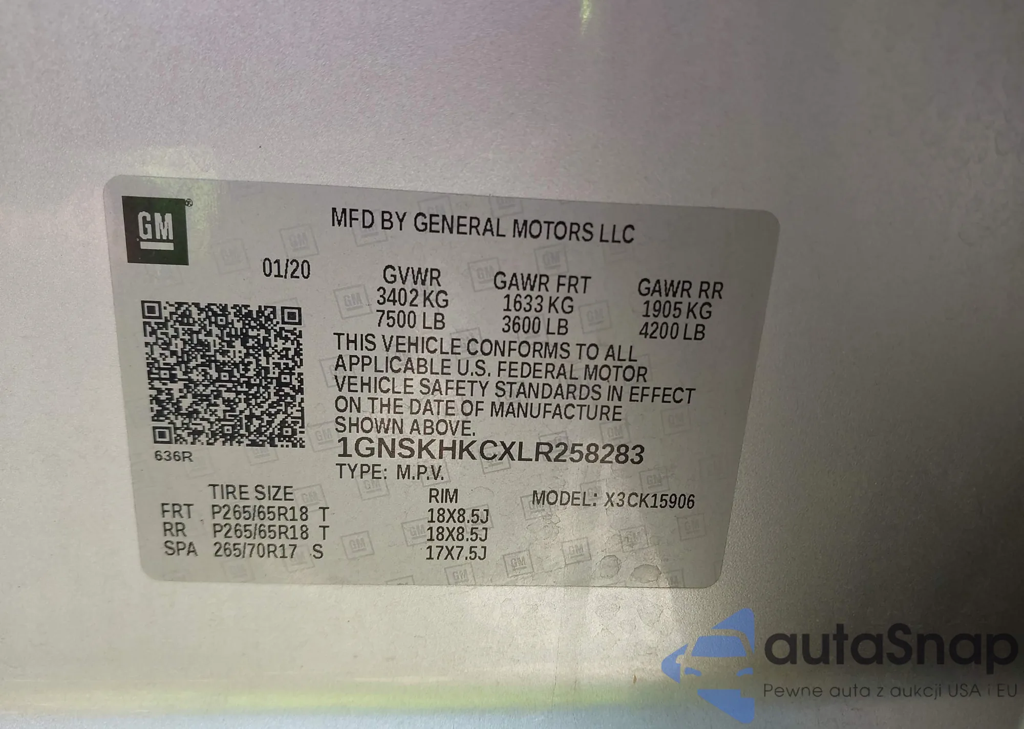 LOT: 42735336 VIN: 1GNSKHKCXLR258283