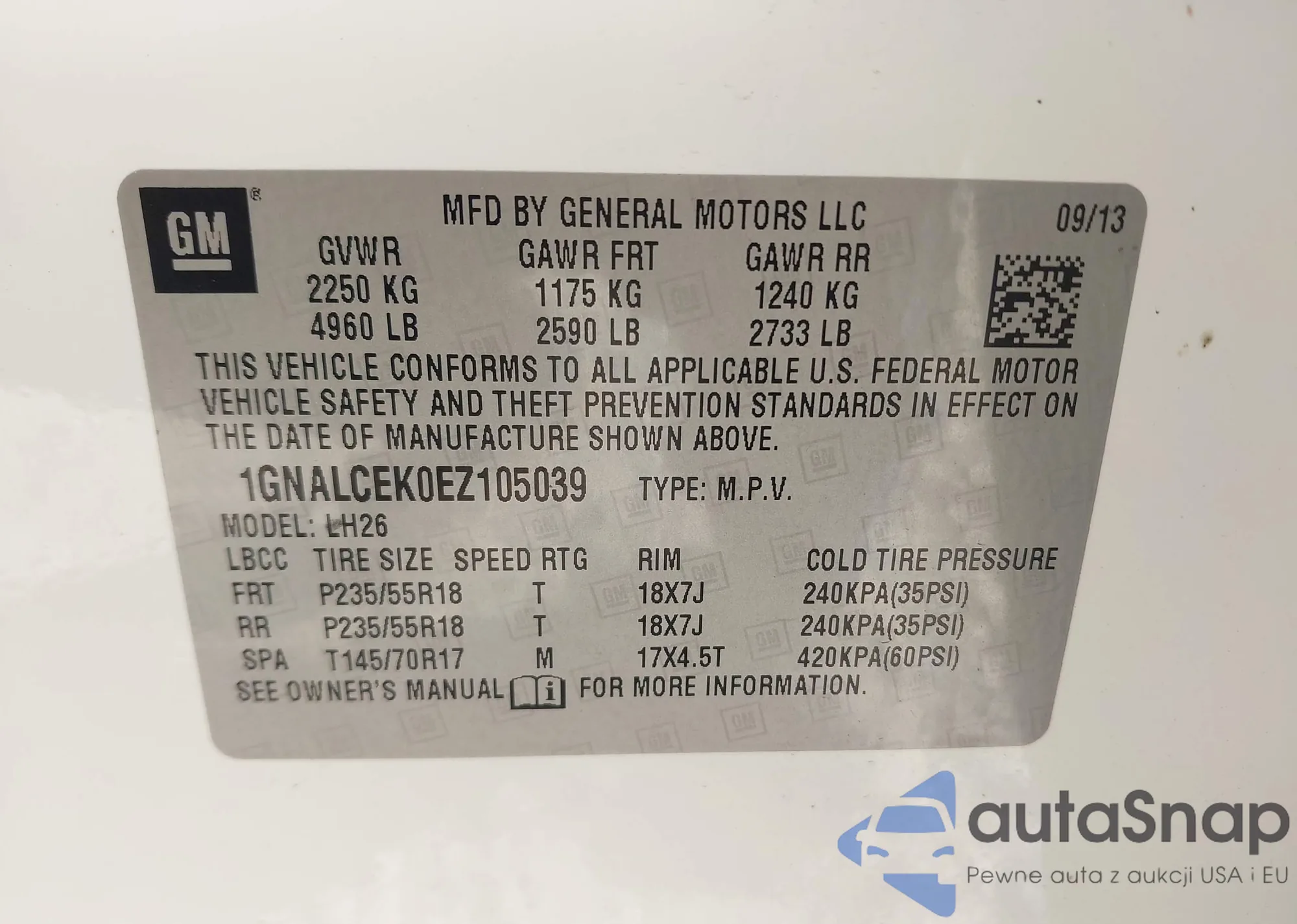 LOT: 42739698 VIN: 1GNALCEK0EZ105039