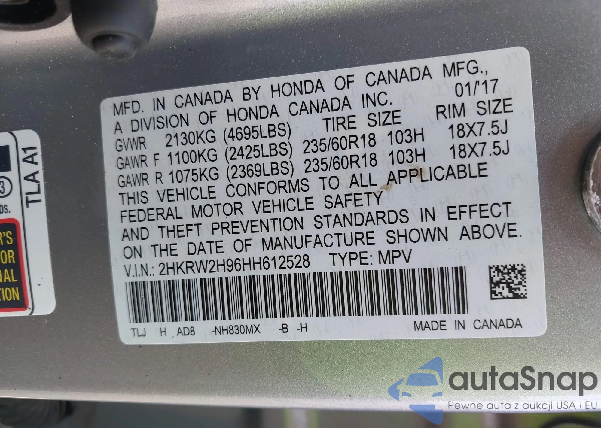 • VIN 2HKRW2H96HH612528