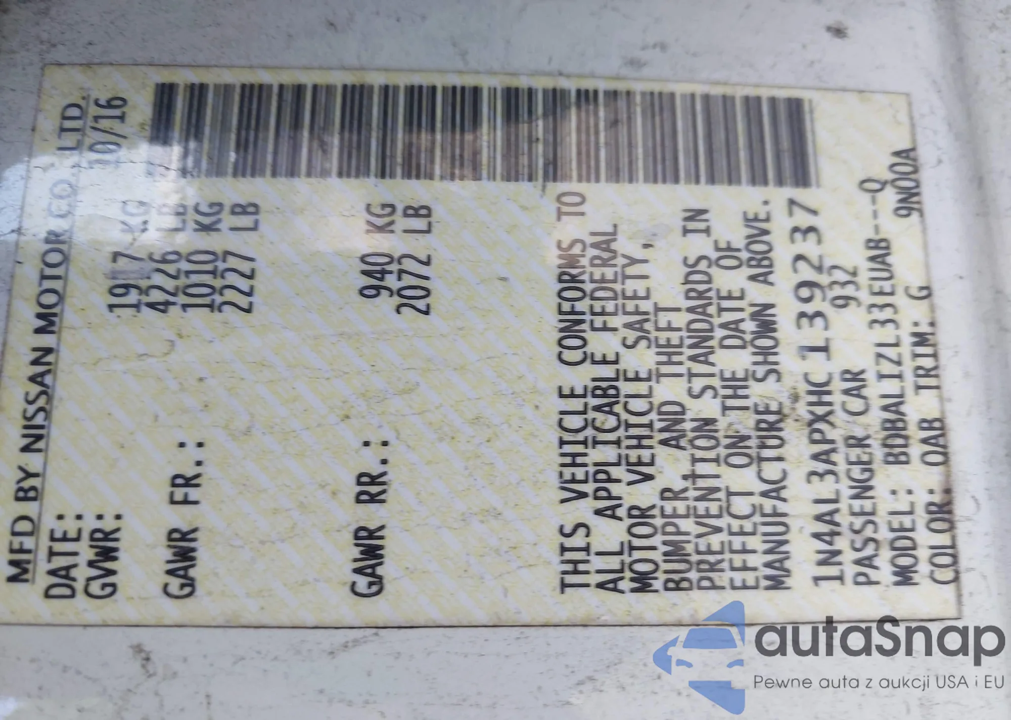 LOT: 42658963 VIN: 1N4AL3APXHC139237
