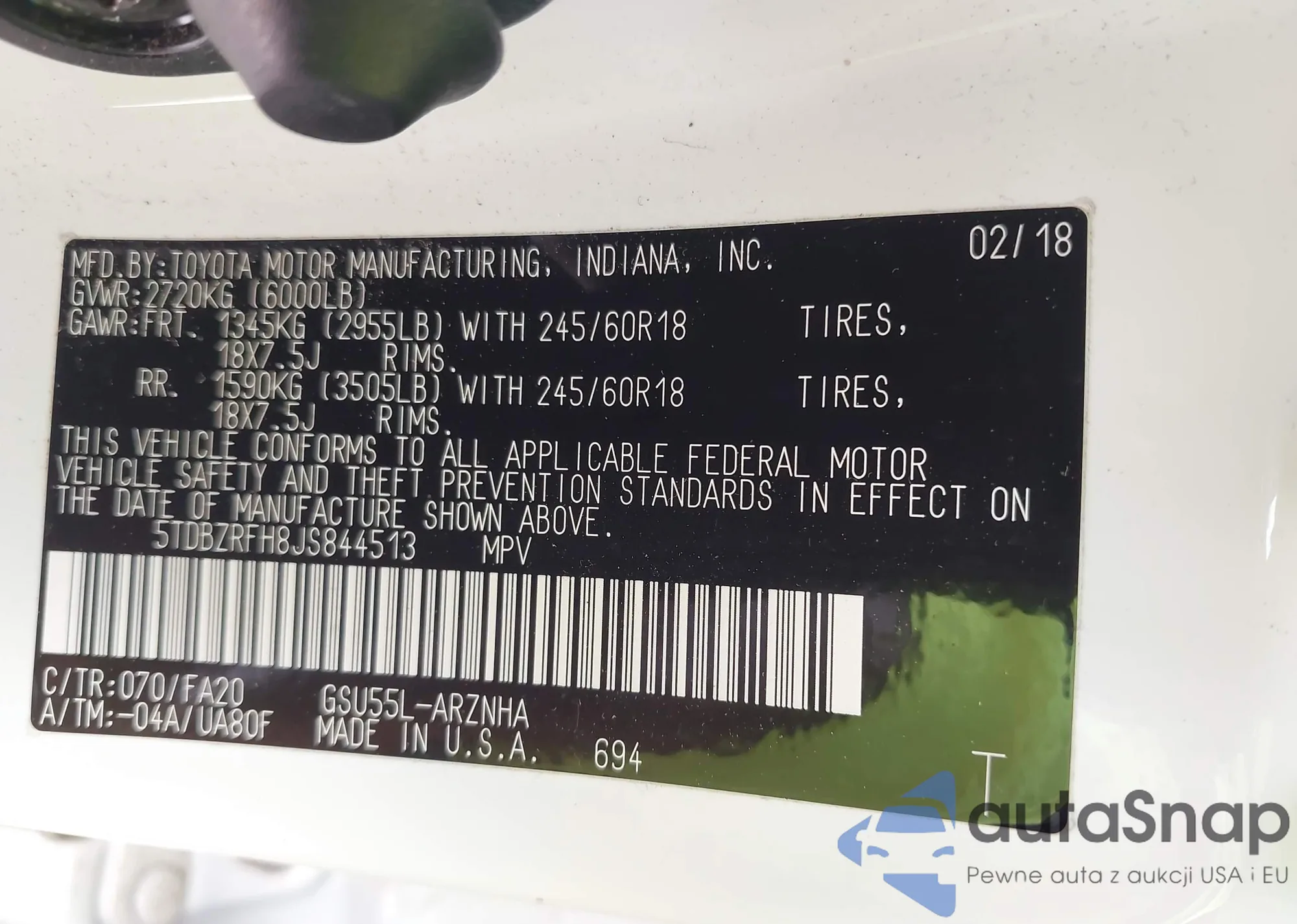 LOT: 42786149 VIN: 5TDBZRFH8JS844513