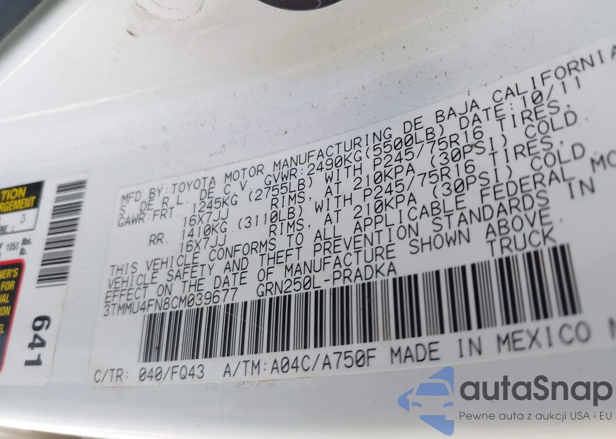 • VIN 3TMMU4FN8CM039677