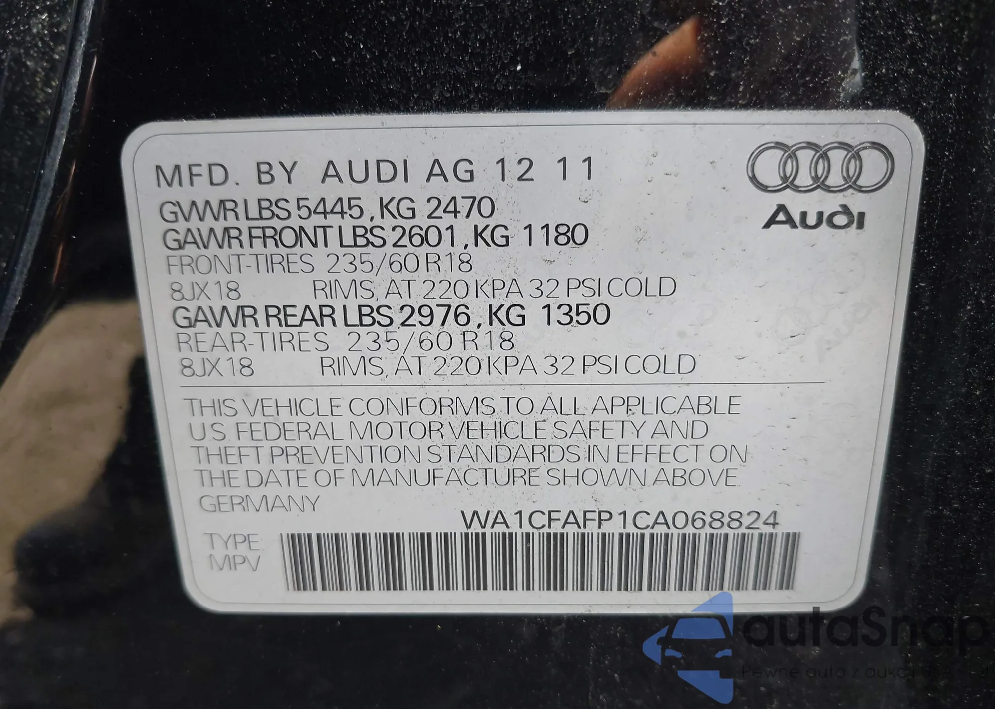 LOT: 42631023 VIN: WA1CFAFP1CA068824