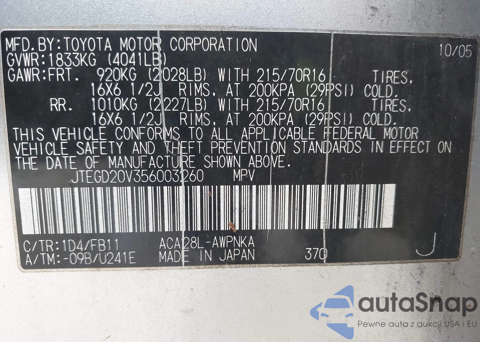 LOT: 42739948 VIN: JTEGD20V356003260