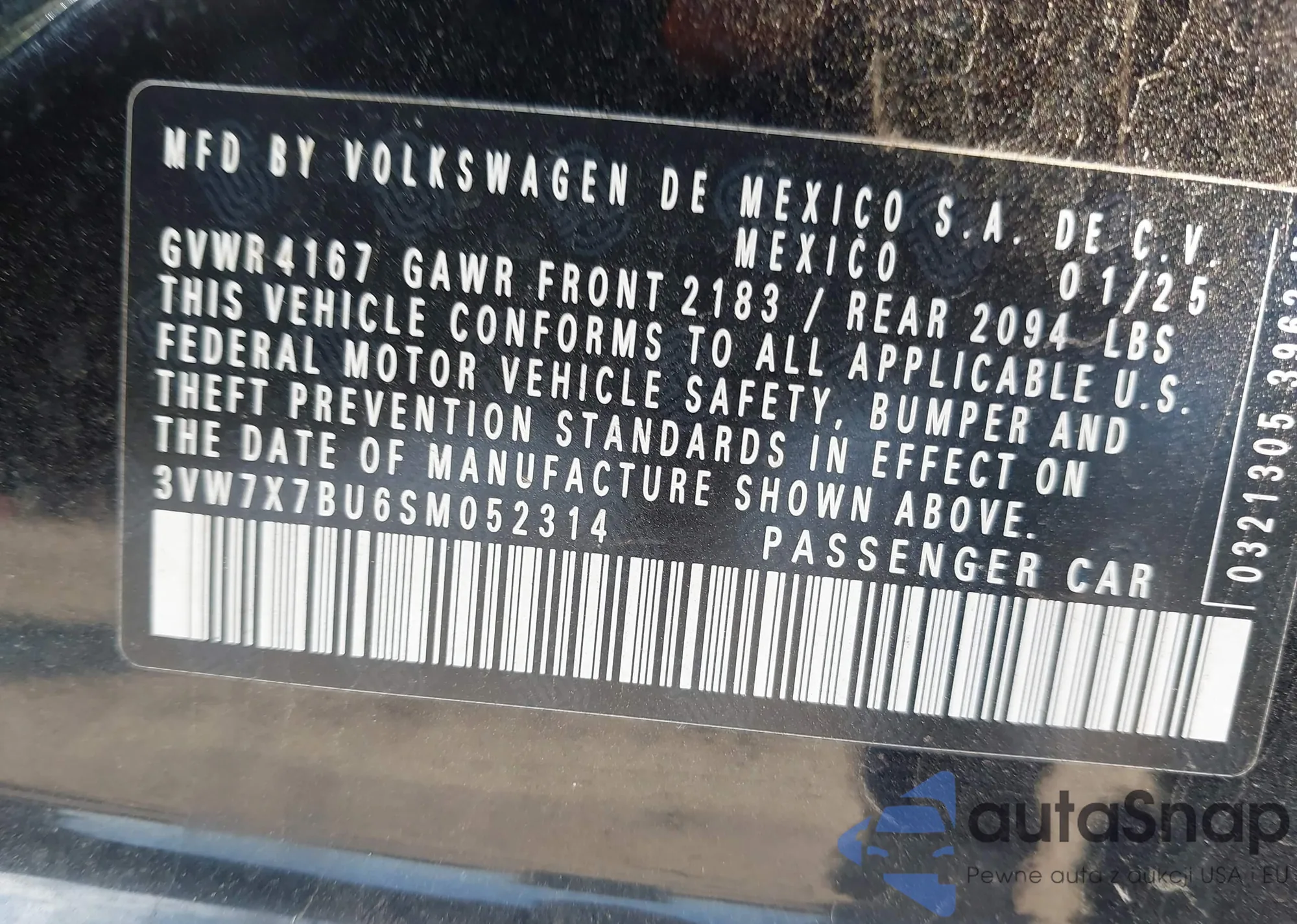 • VIN 3VW7X7BU6SM052314