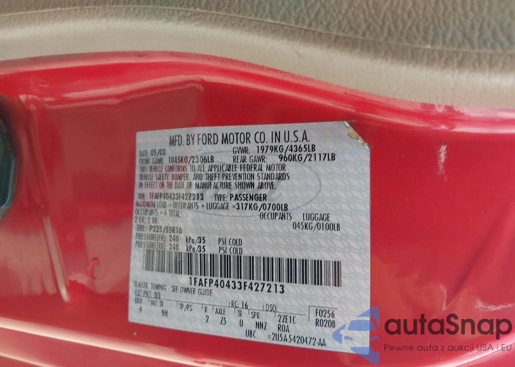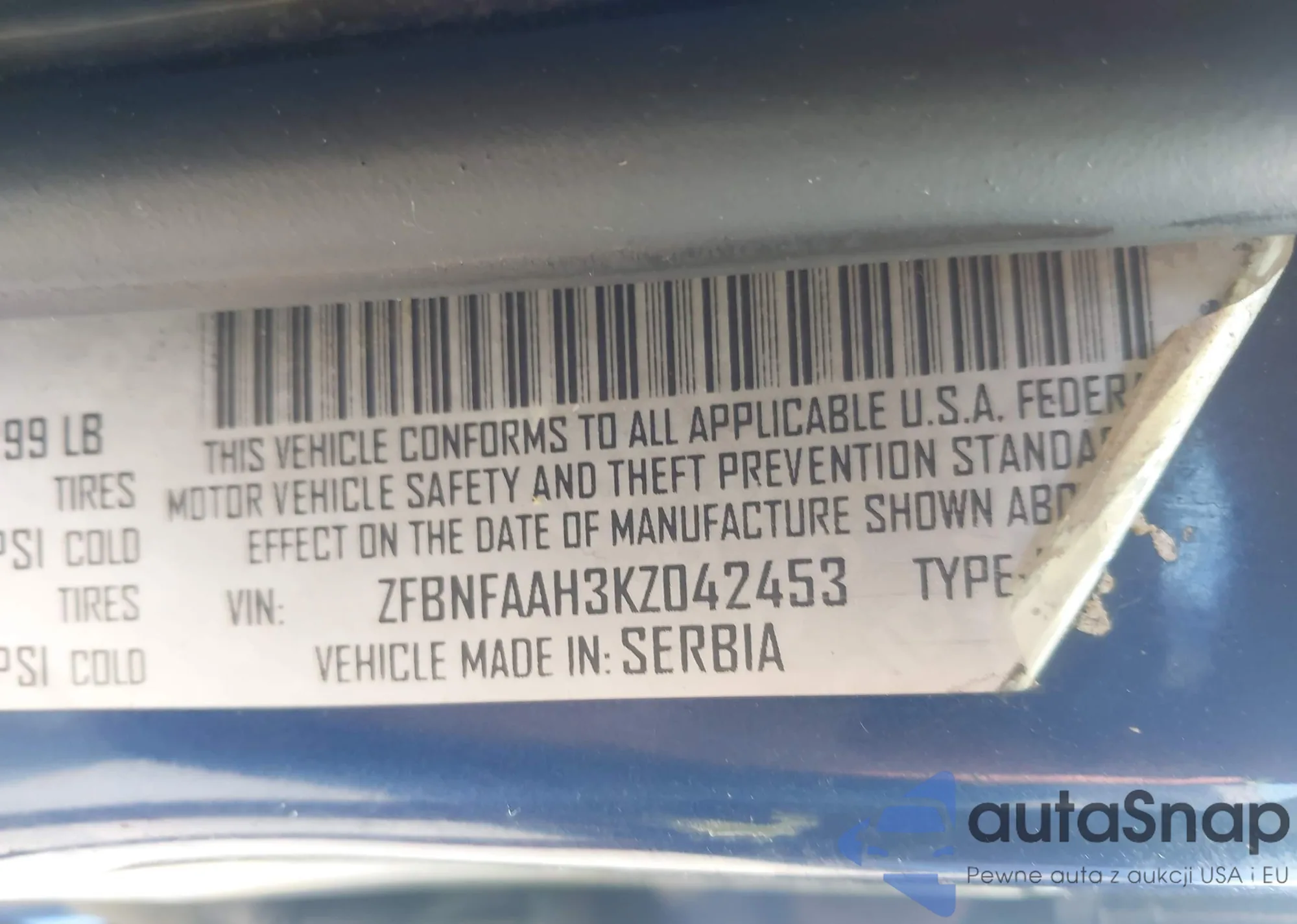 LOT: 42716575 VIN: ZFBNFAAH3KZ042453