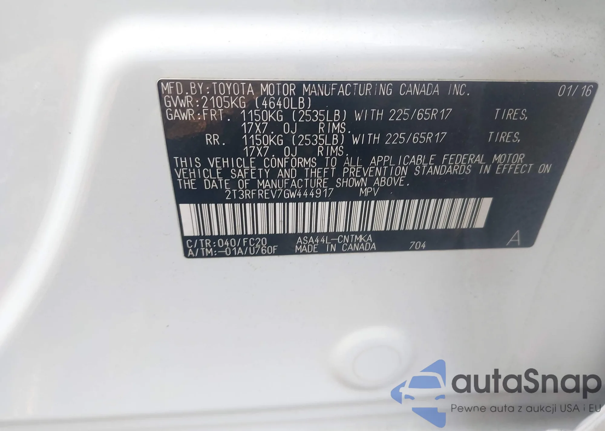 • VIN 2T3RFREV7GW444917