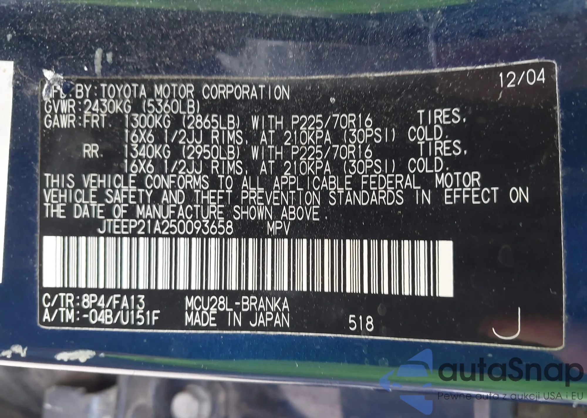 LOT: 42893203 VIN: JTEBU14RX68068646
