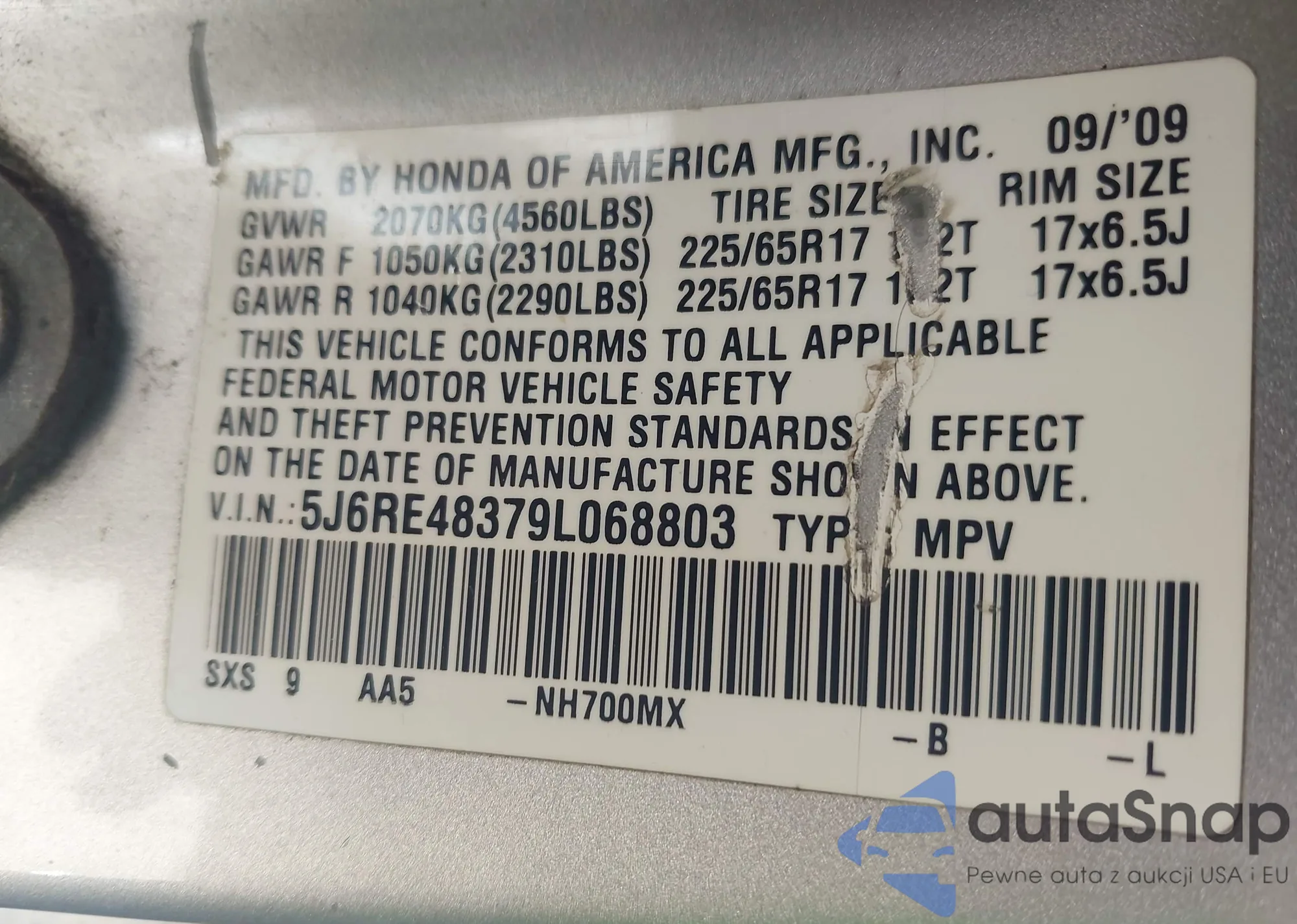 • VIN 5J6RE48379L068803