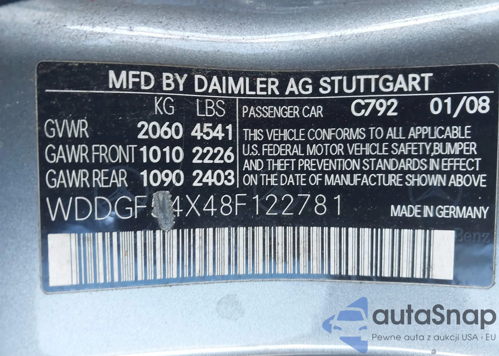 LOT: 42881319 VIN: WDDGF54X48F122781