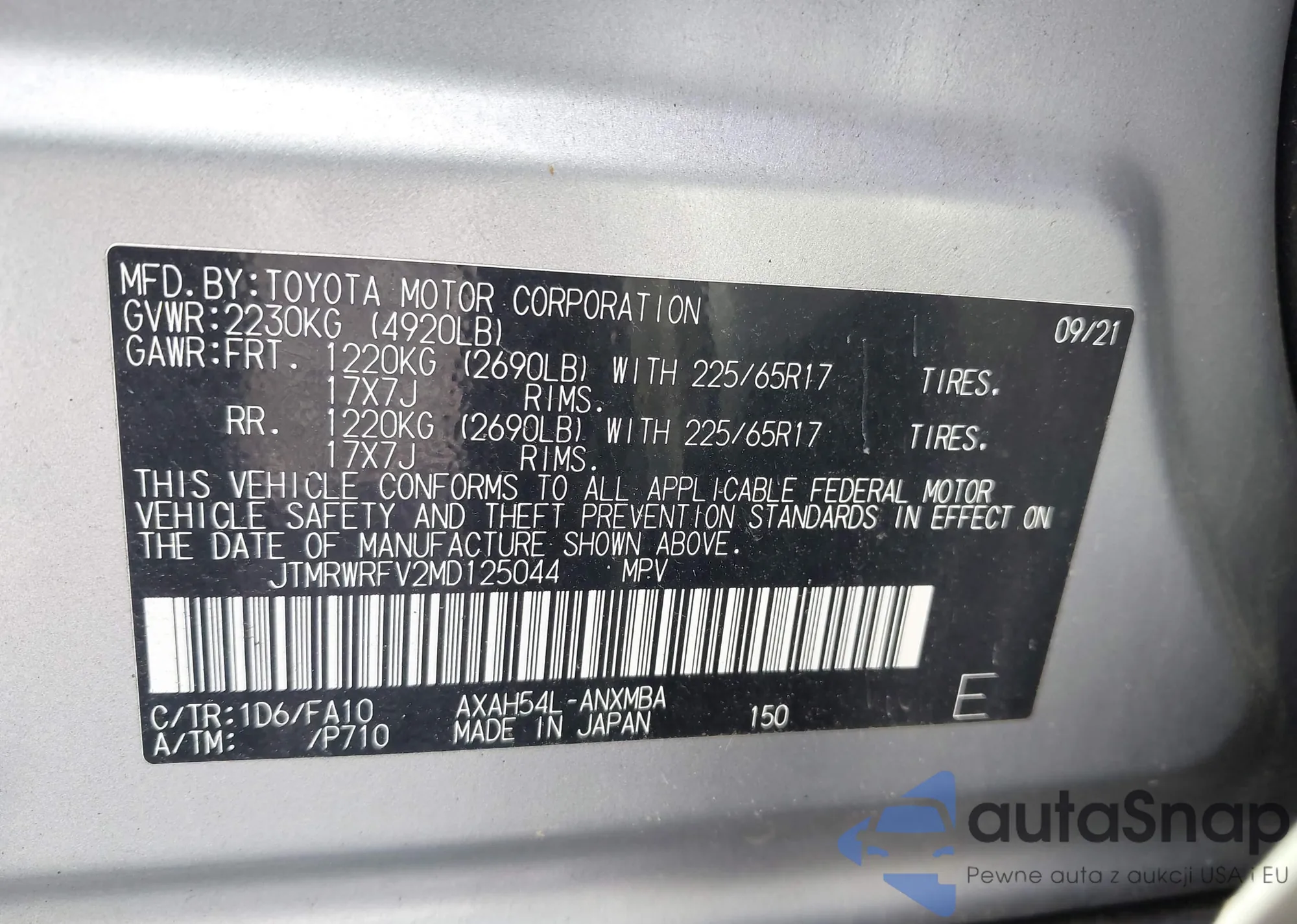 LOT: 42708693 VIN: JTMRWRFV2MD125044