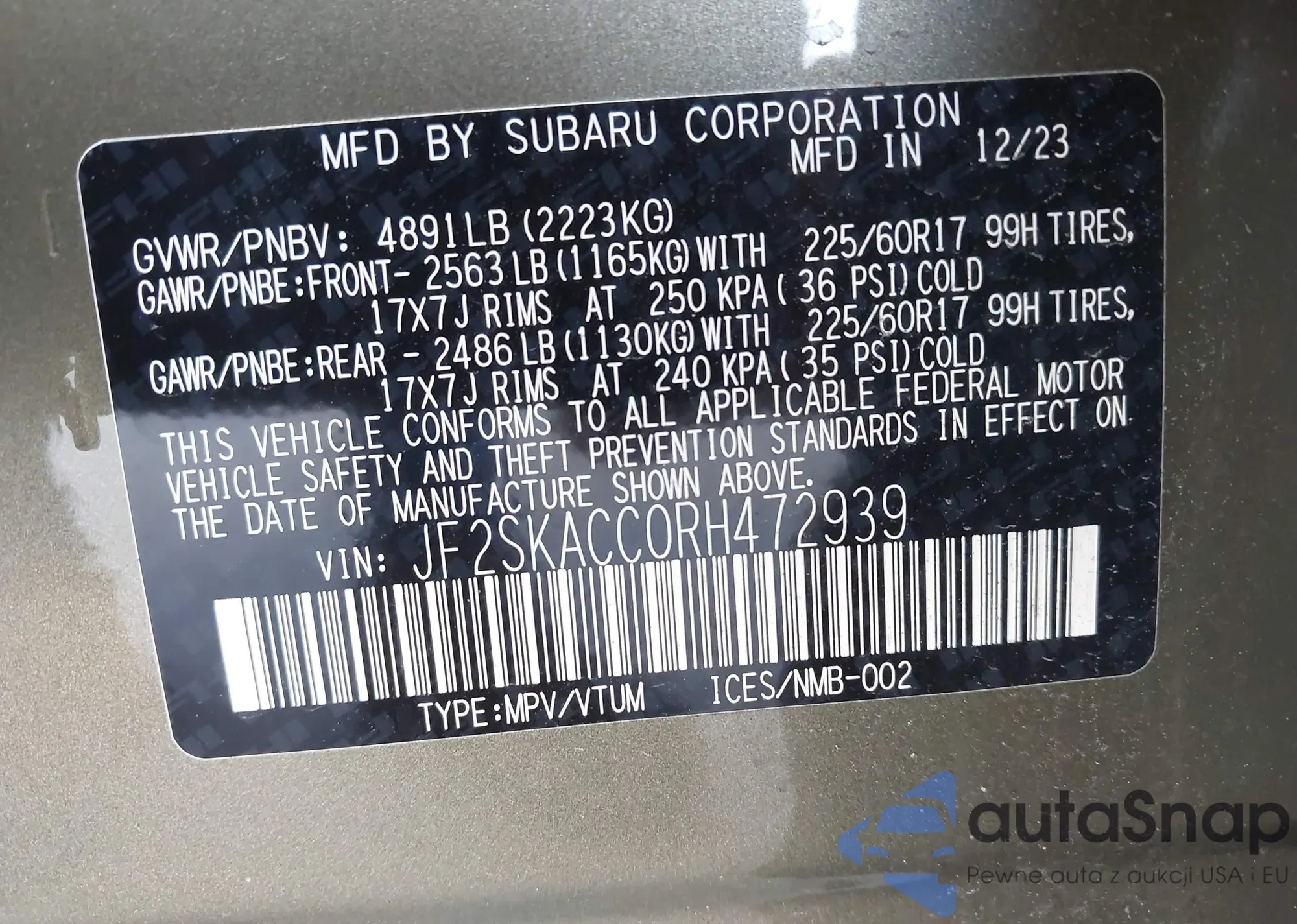 LOT: 42706818 VIN: JF2SKACC0RH472939