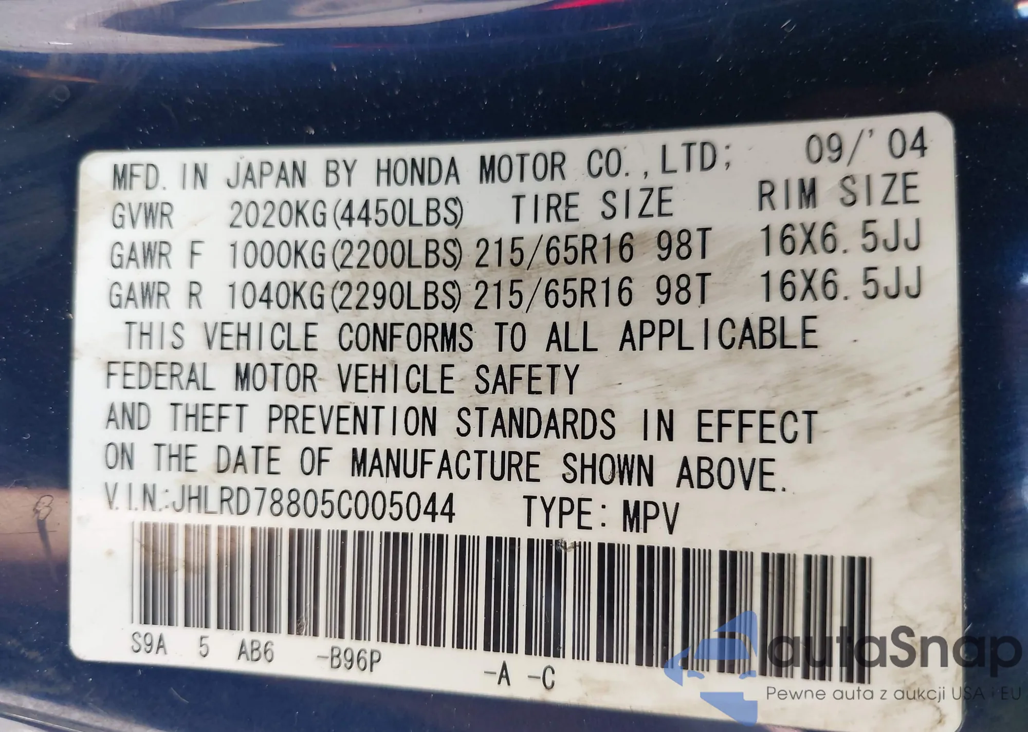 LOT: 42857380 VIN: JHLRD78805C005044