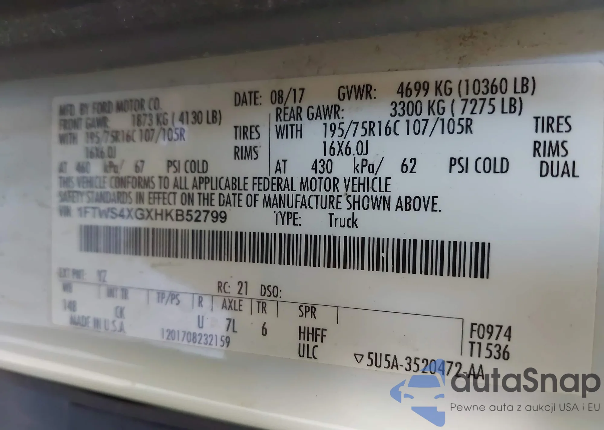 LOT: 42753522 VIN: 1FTWS4XGXHKB52799