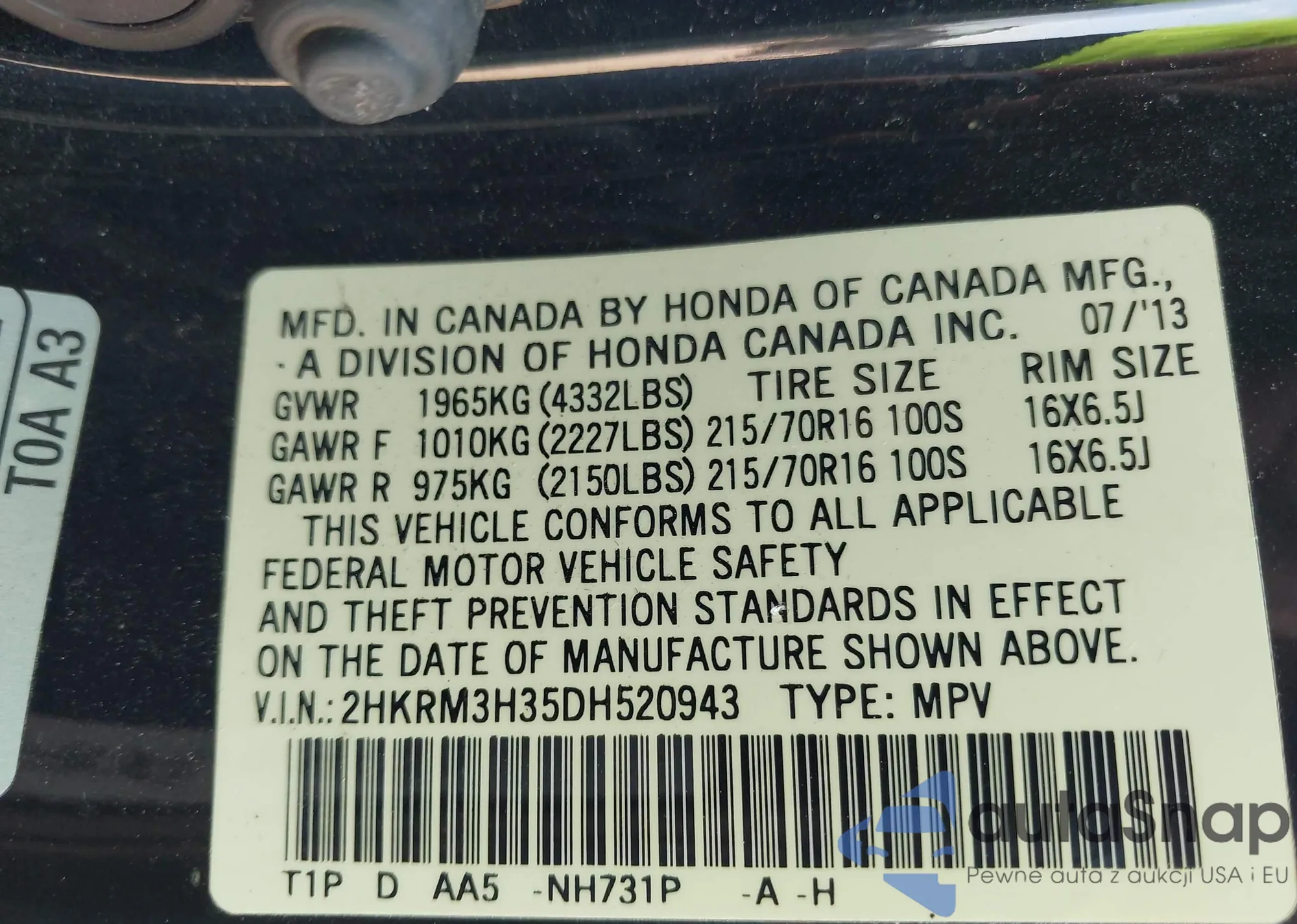 • VIN 2HKRM3H35DH520943
