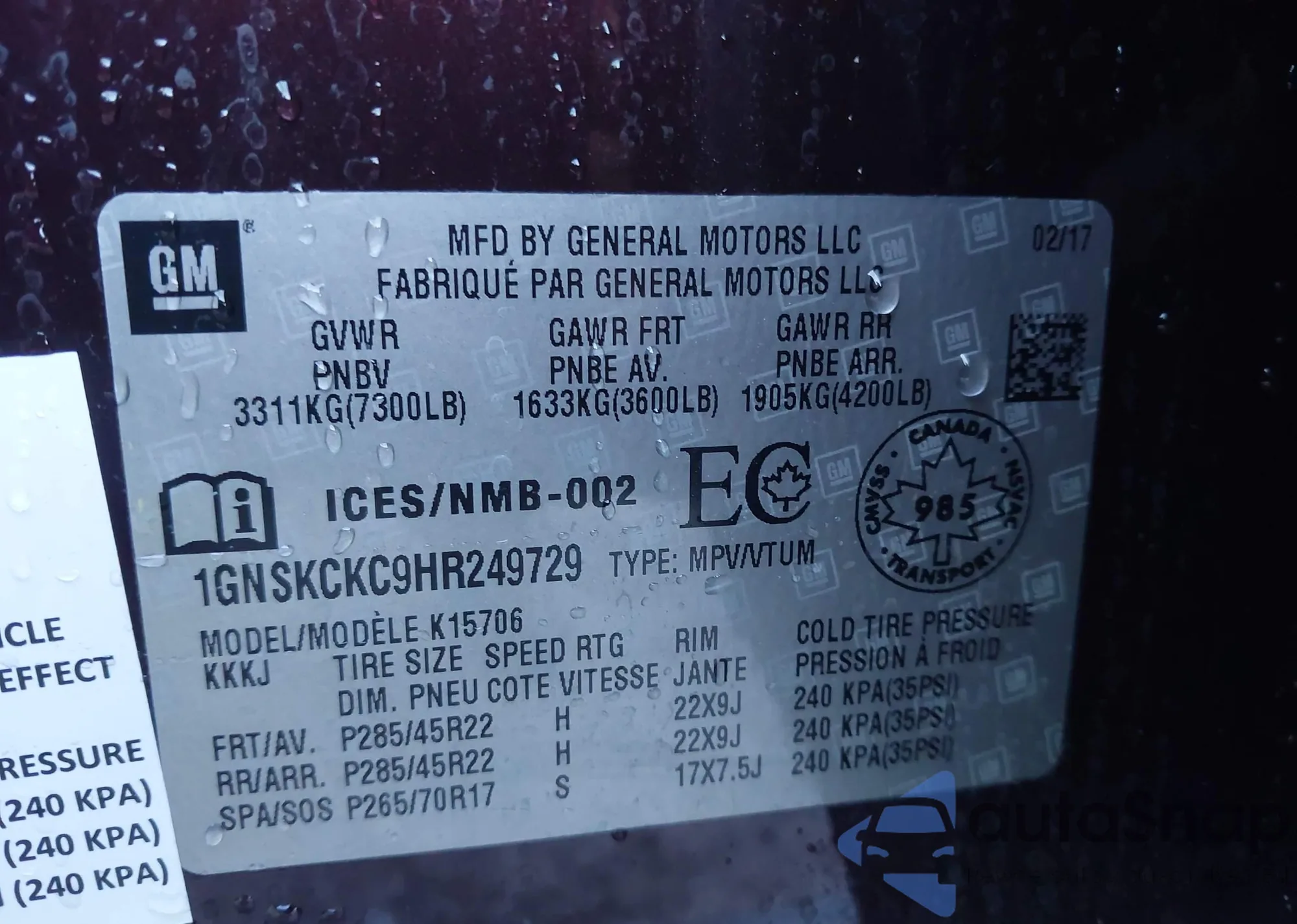 • VIN 1GNSKCKC9HR249729