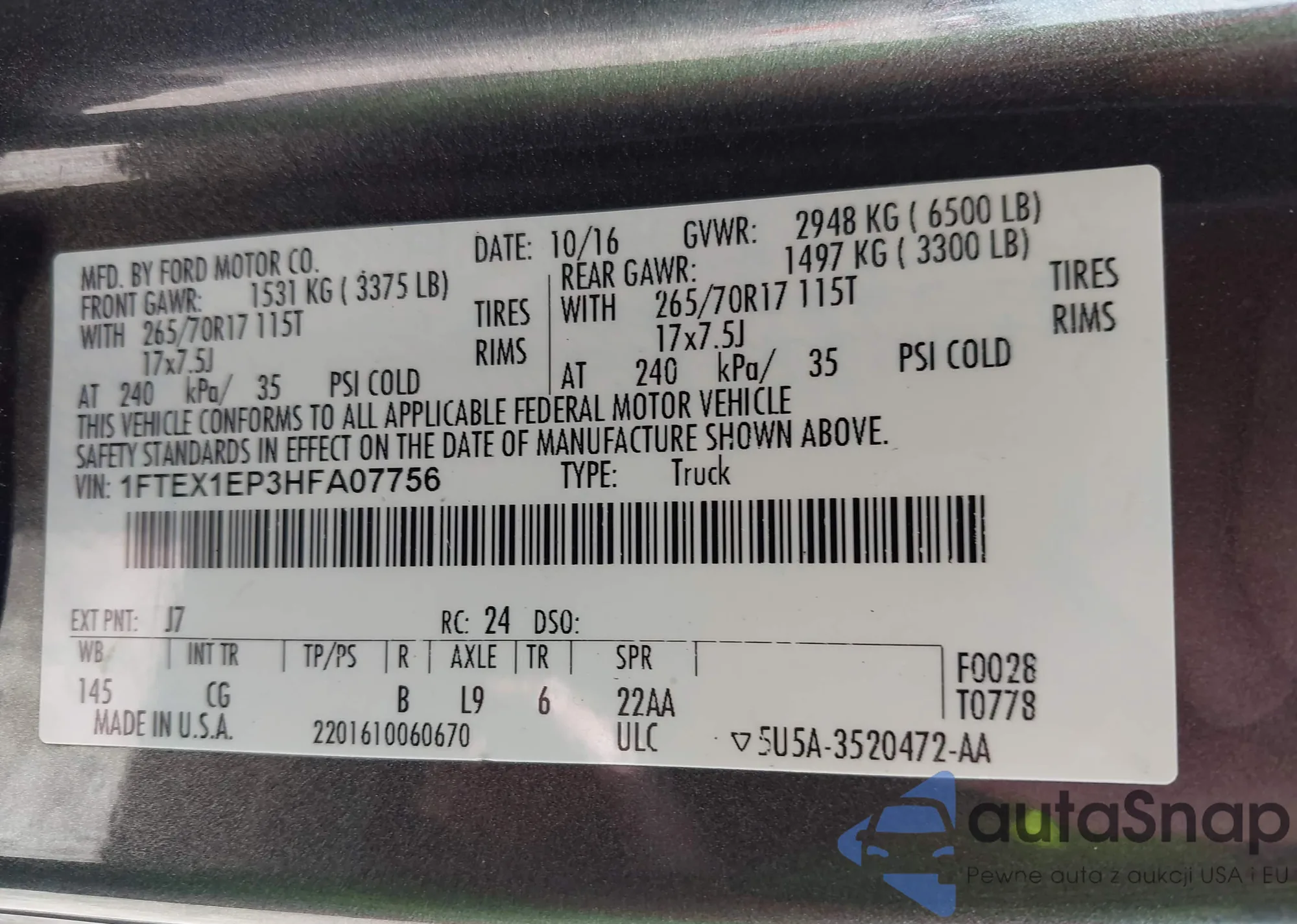 LOT: 42963449 VIN: 1FTEX1EP3HFA07756