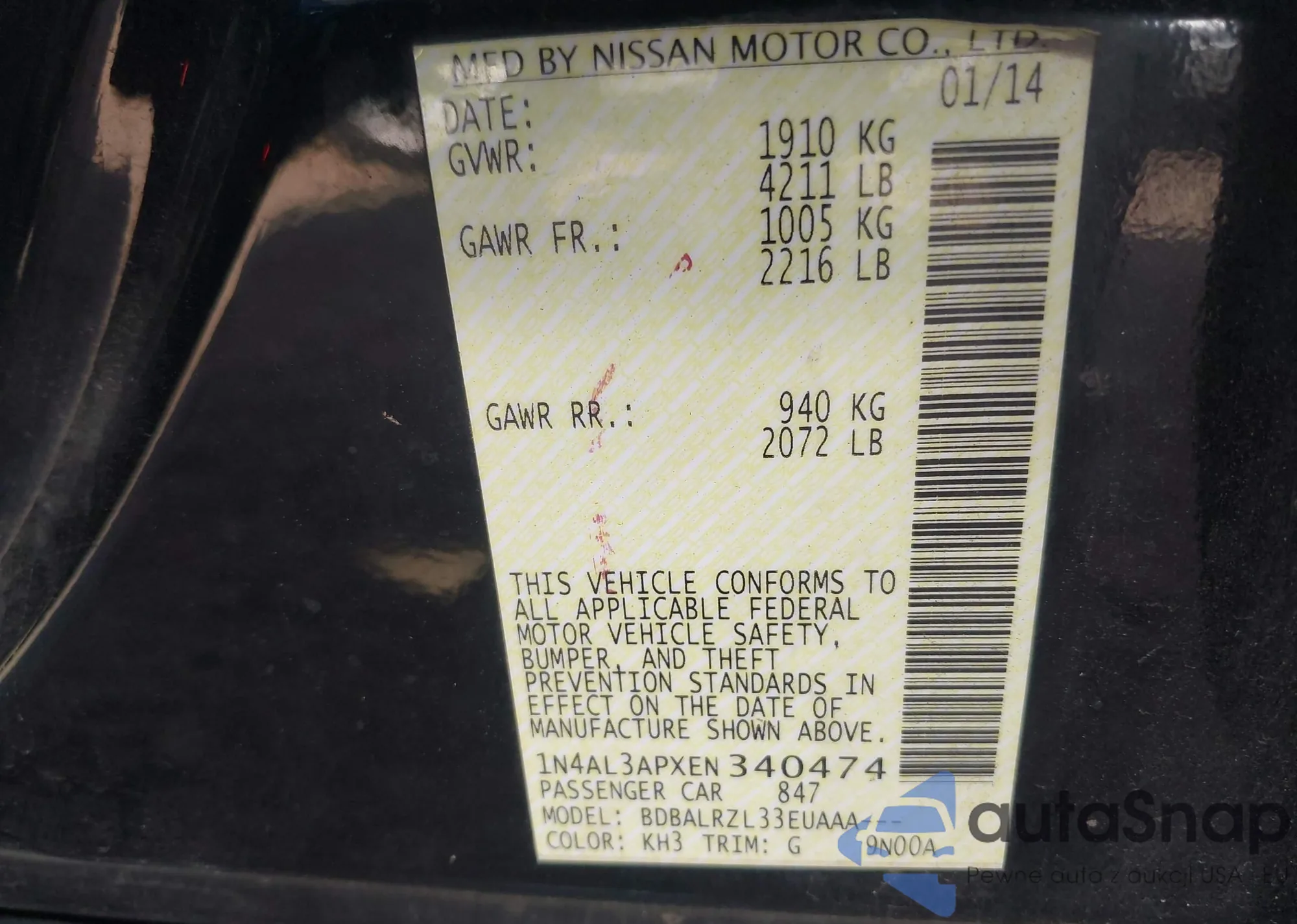 LOT: 42935638 VIN: 1N4AL3APXEN340474