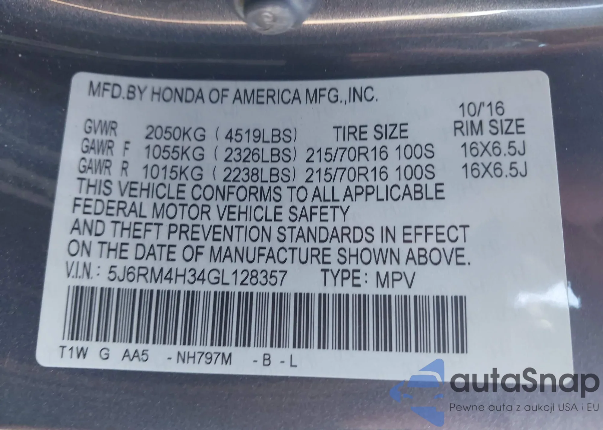 • VIN 5J6RM4H34GL128357