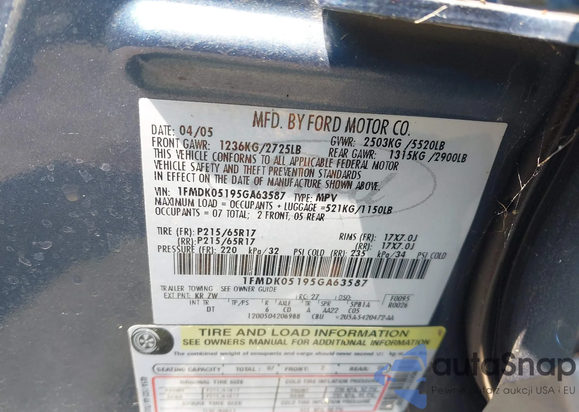 LOT: 42840239 VIN: 1FMDK05195GA63587