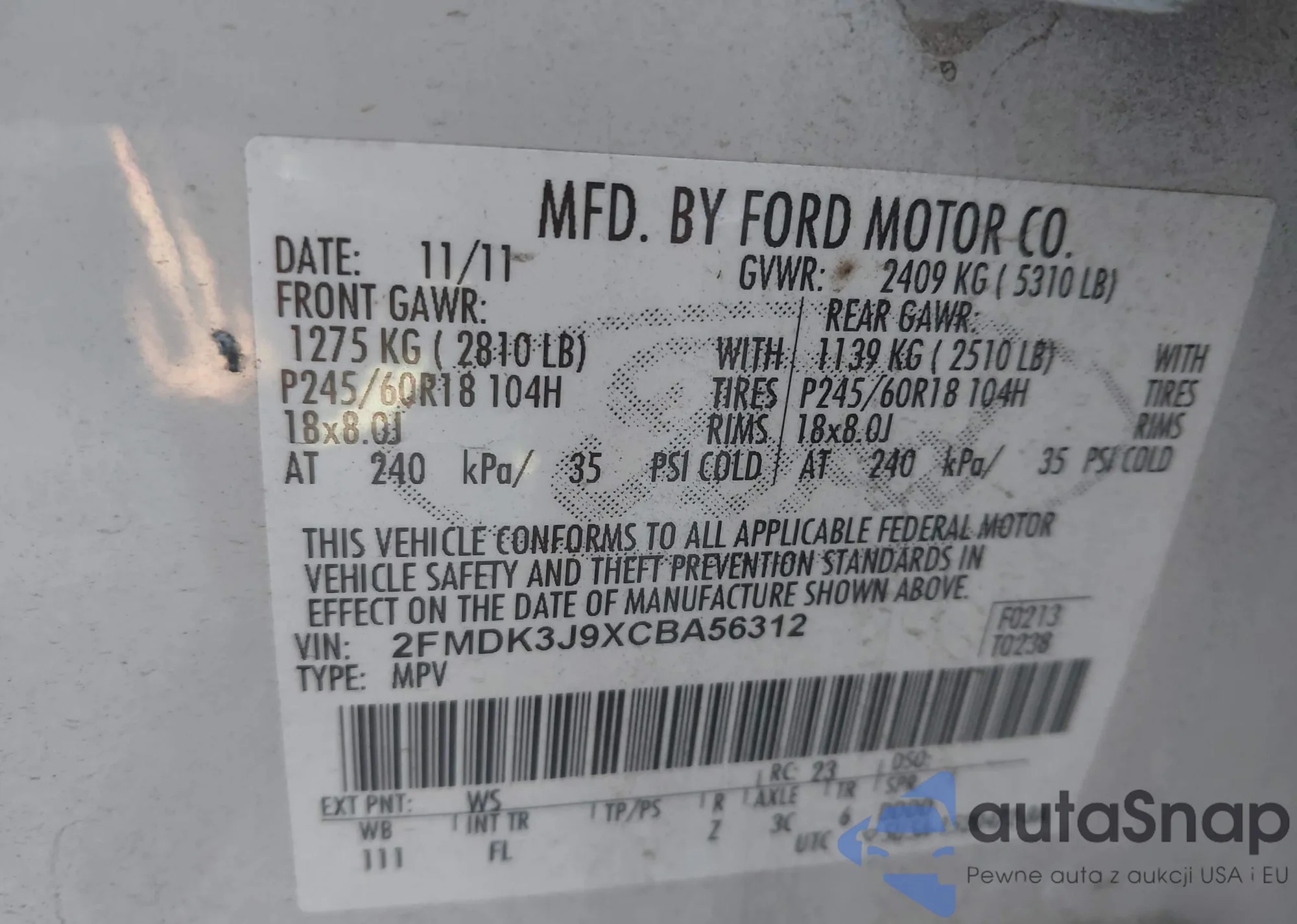 • VIN 2FMDK3J9XCBA56312