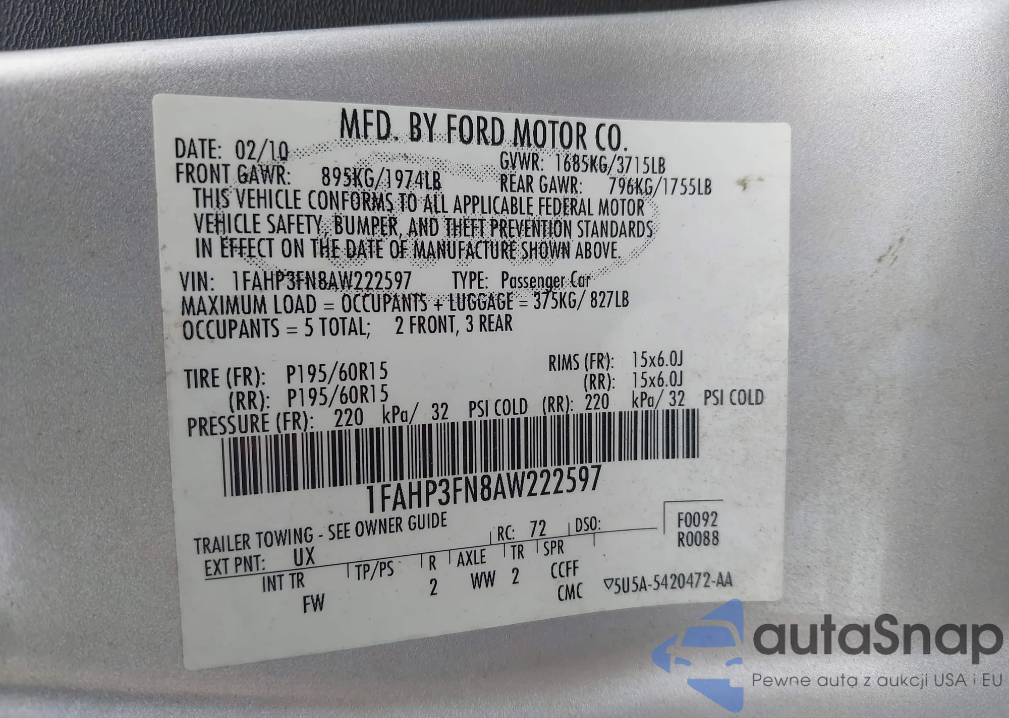 • VIN 1FAHP3FN8AW222597